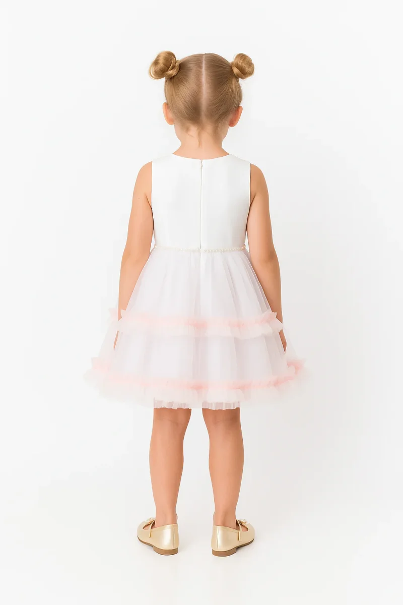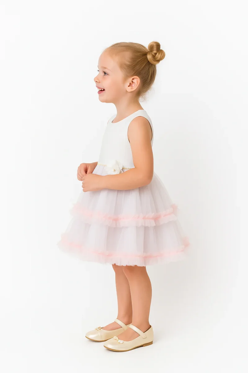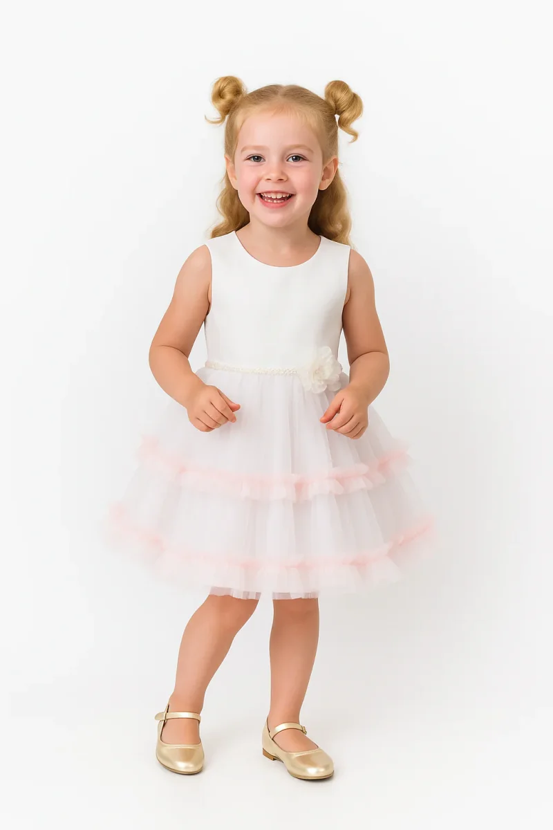 Vesti la tua piccola avventuriera con questo abito da sogno in tulle, con doppia balza in contrasto per un tocco di audacia. La cintura di perline in vita e la spilla di fiore coordinata aggiungono un tocco di eleganza, mentre la chiusura con cerniera posteriore assicura una vestibilità comoda e sicura.