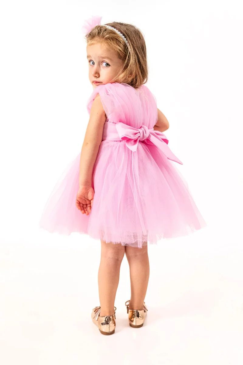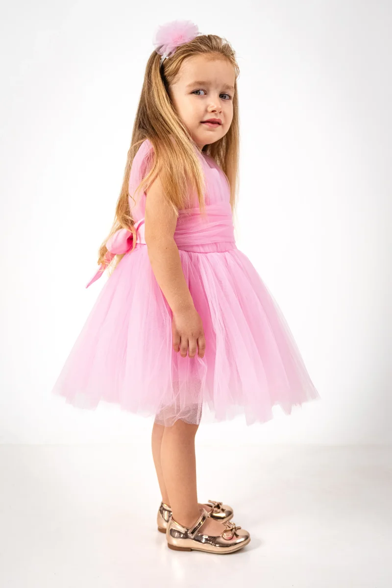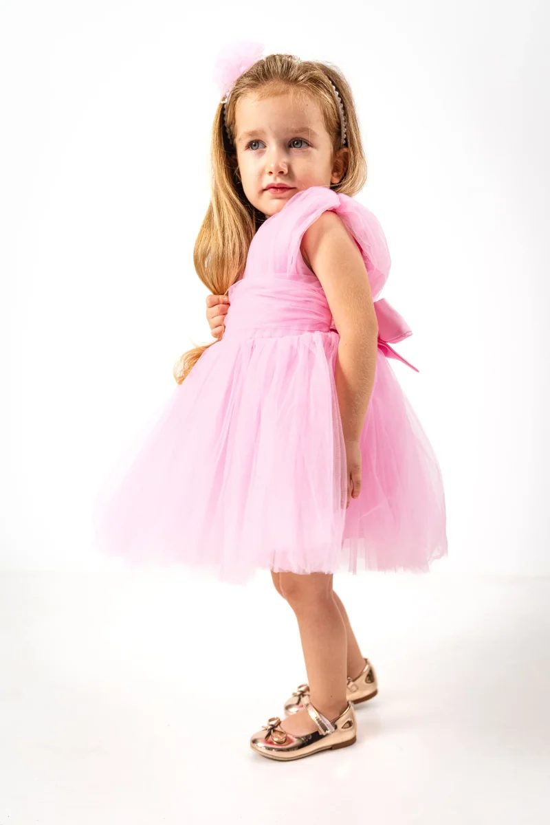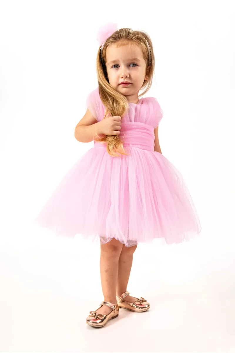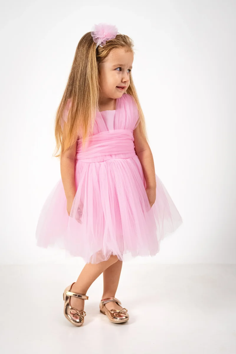 Vesti la tua piccola farfalla con l’abito Butterfly! Realizzato in morbido tulle con corpetto in satin e cintura in vita in tulle, questo abito offre un look elegante e comodo. Con una gonna effetto tutù e chiusura con cerniera posteriore e cintura in satin, sarà la scelta perfetta per ogni occasione speciale.
