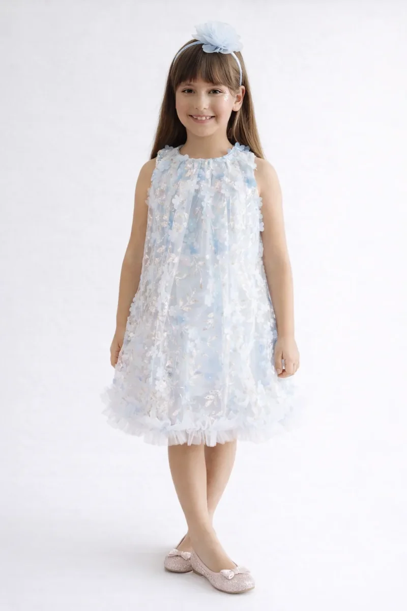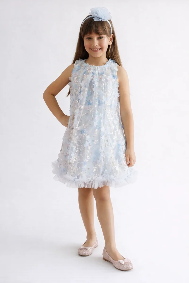 Questo abito incanta con un’eleganza sofisticata pensata per le piccole protagoniste. La fodera in raso garantisce comfort e morbidezza sulla pelle, mentre il tulle ricamato di paillettes scintillanti cattura la luce ad ogni movimento. I fiori in rilievo aggiungono una dimensione tattile e visiva straordinaria, creando un effetto tridimensionale che distingue questo capo dai classici abiti per bambina. Le rouche sul fondo donano movimento e grazia, mentre la vestibilità morbida permette libertà di movimento senza compromessi. La chiusura con cerniera posteriore assicura praticità nel vestire e svestire. Perfetto per matrimoni, battesimi e occasioni speciali dove il dettaglio fa la differenza.