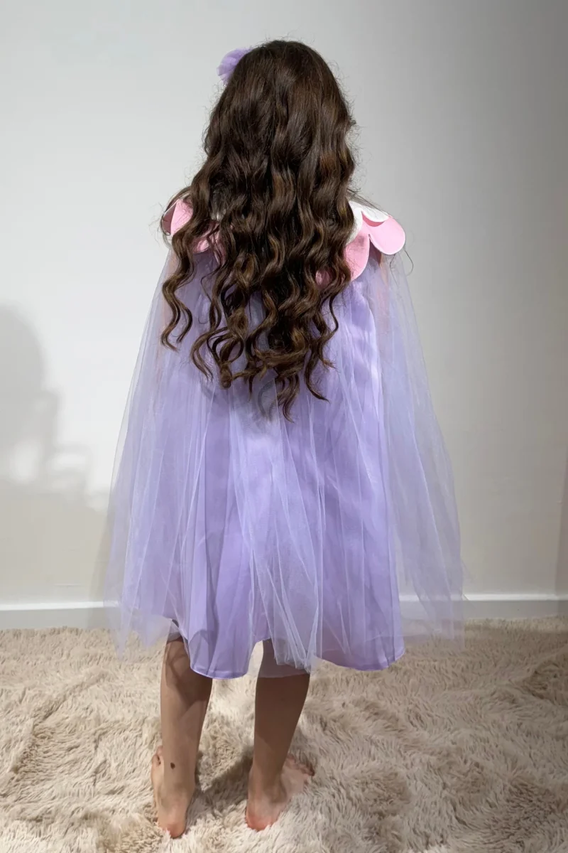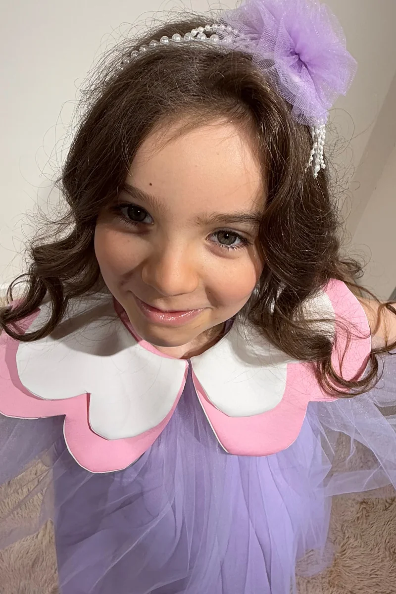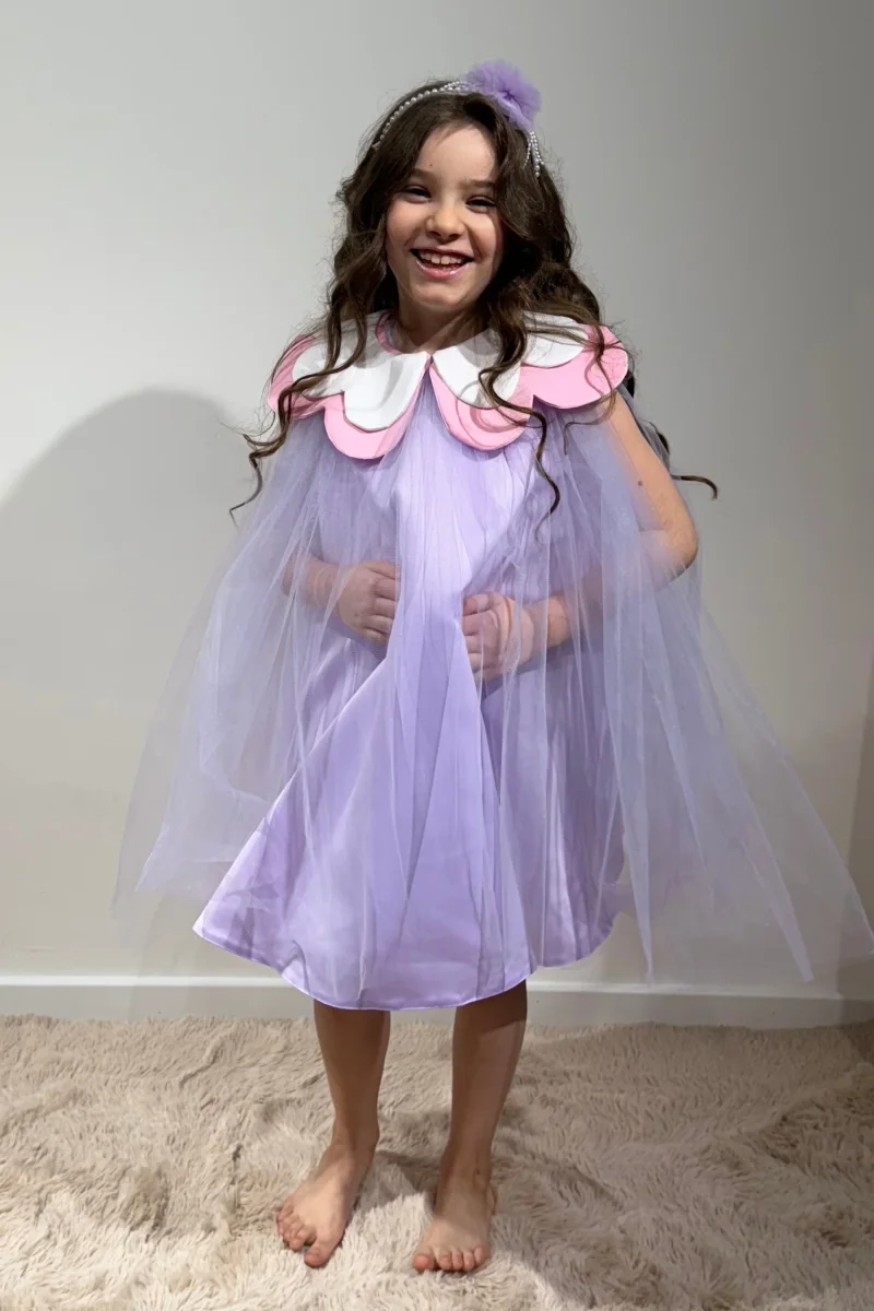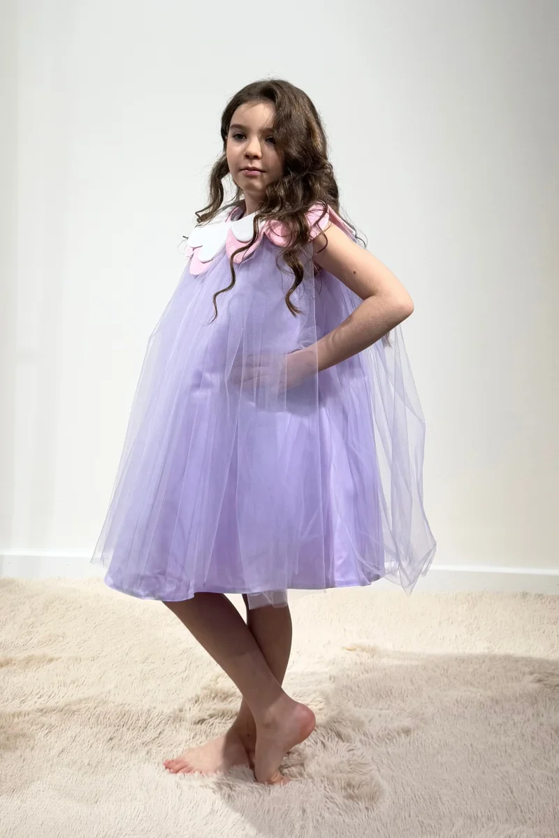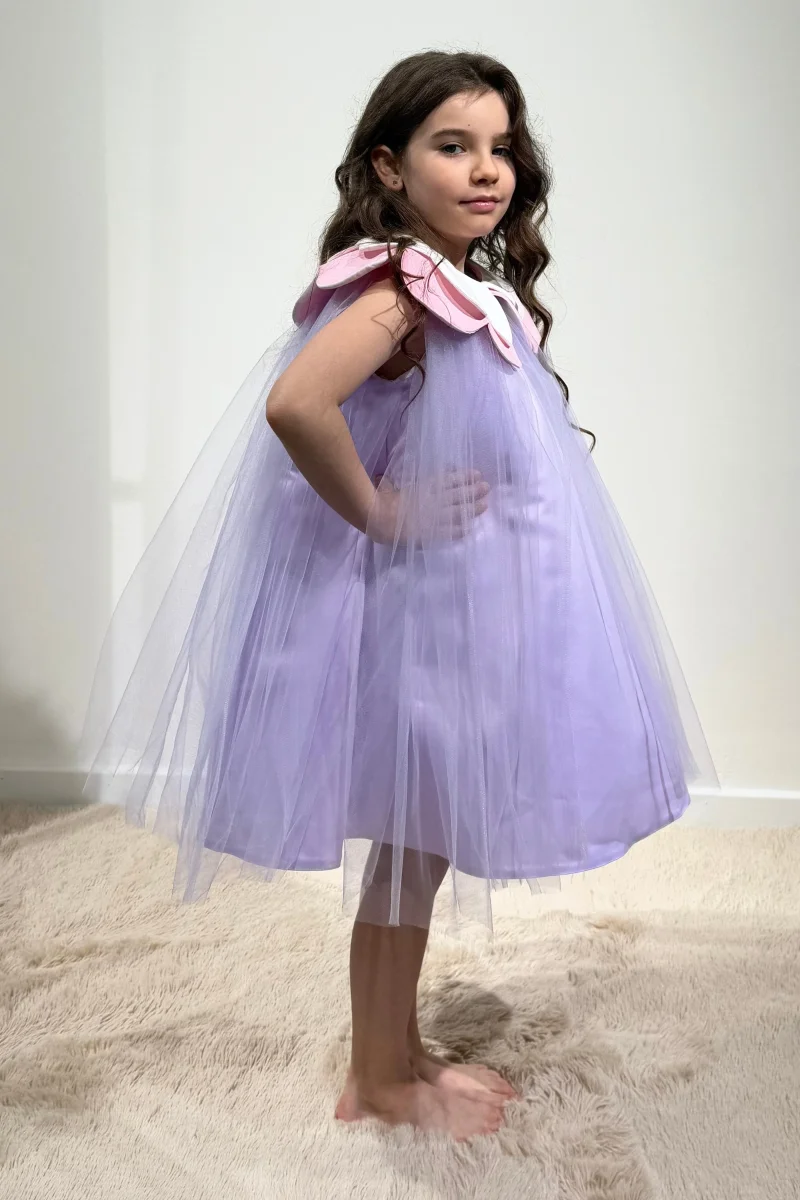 Splendido abito corto in tulle lilla, con delizioso colletto rimovibile a forma di fiore bianco e rosa. L’abito, dalla chiusura posteriore con cerniera, è ideale per ogni bambina che vuole sentirsi una vera principessa, ma con un tocco di originalità e gioia.