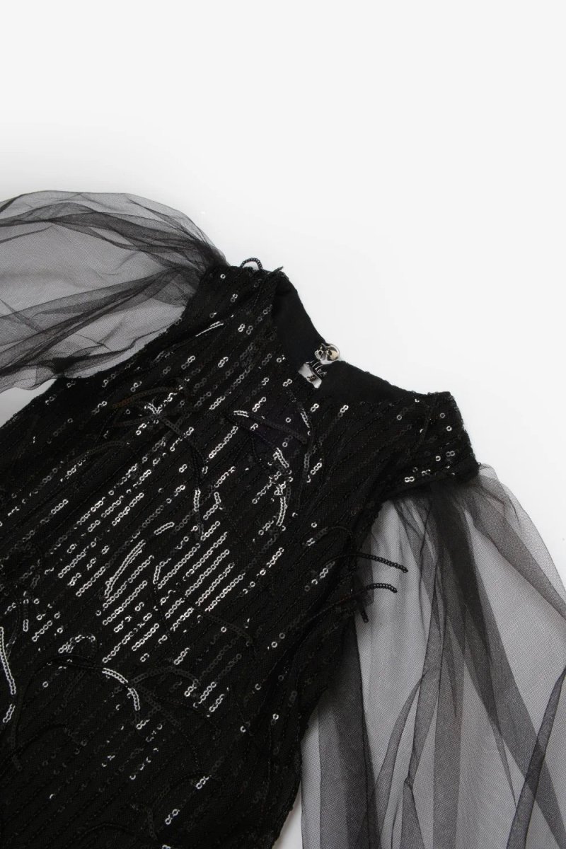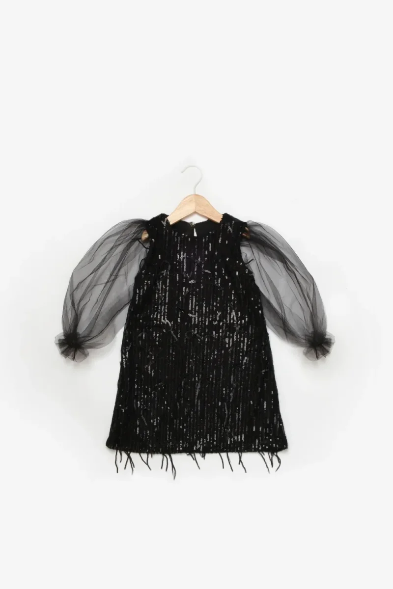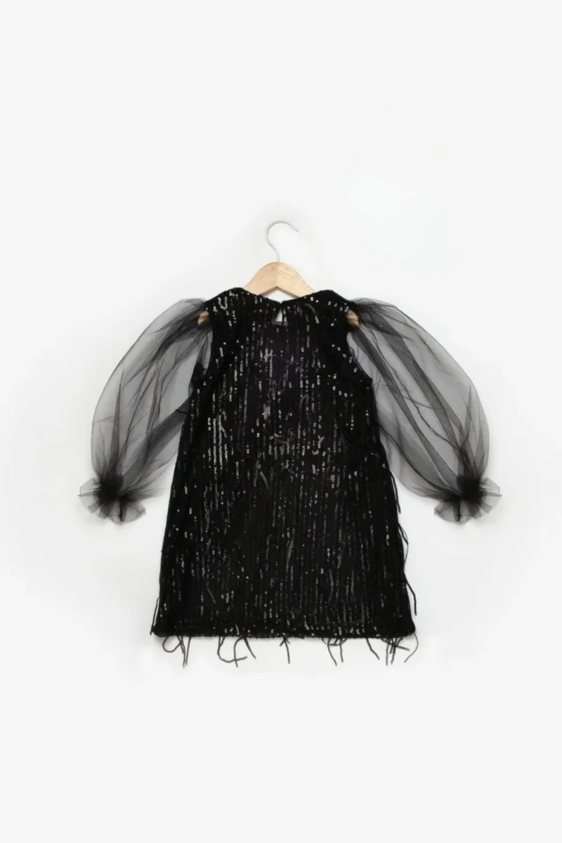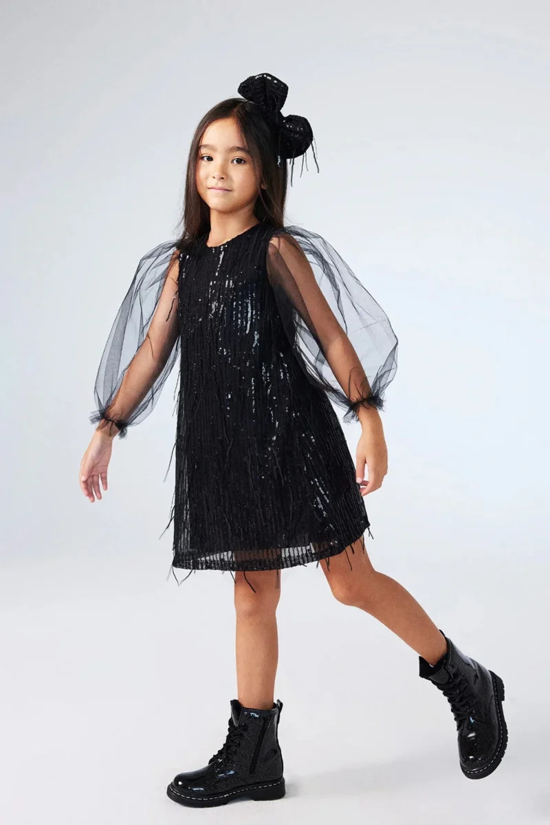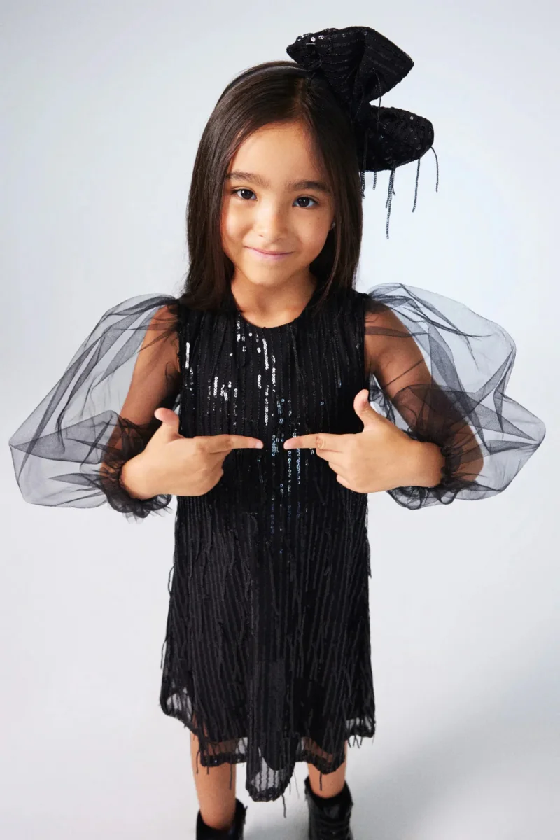 Questo abito in tulle e paillettes per bambina unisce un tocco di magia e audacia. Le maniche in tulle effetto palloncino con elastico al polso creano un volume scenografico, mentre la chiusura posteriore con lampo garantisce praticità. La fodera in cotone assicura comfort e traspirabilità, perfetta per accompagnare ogni piccola protagonista in momenti speciali con stile e personalità.