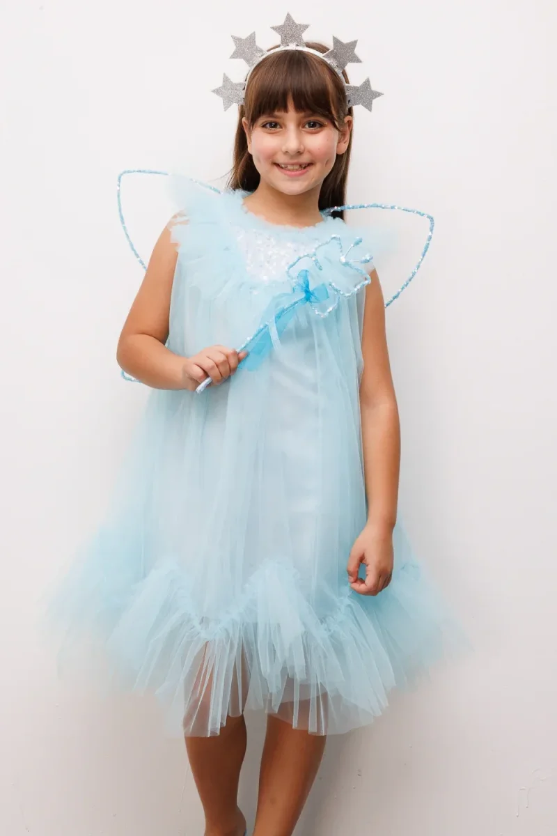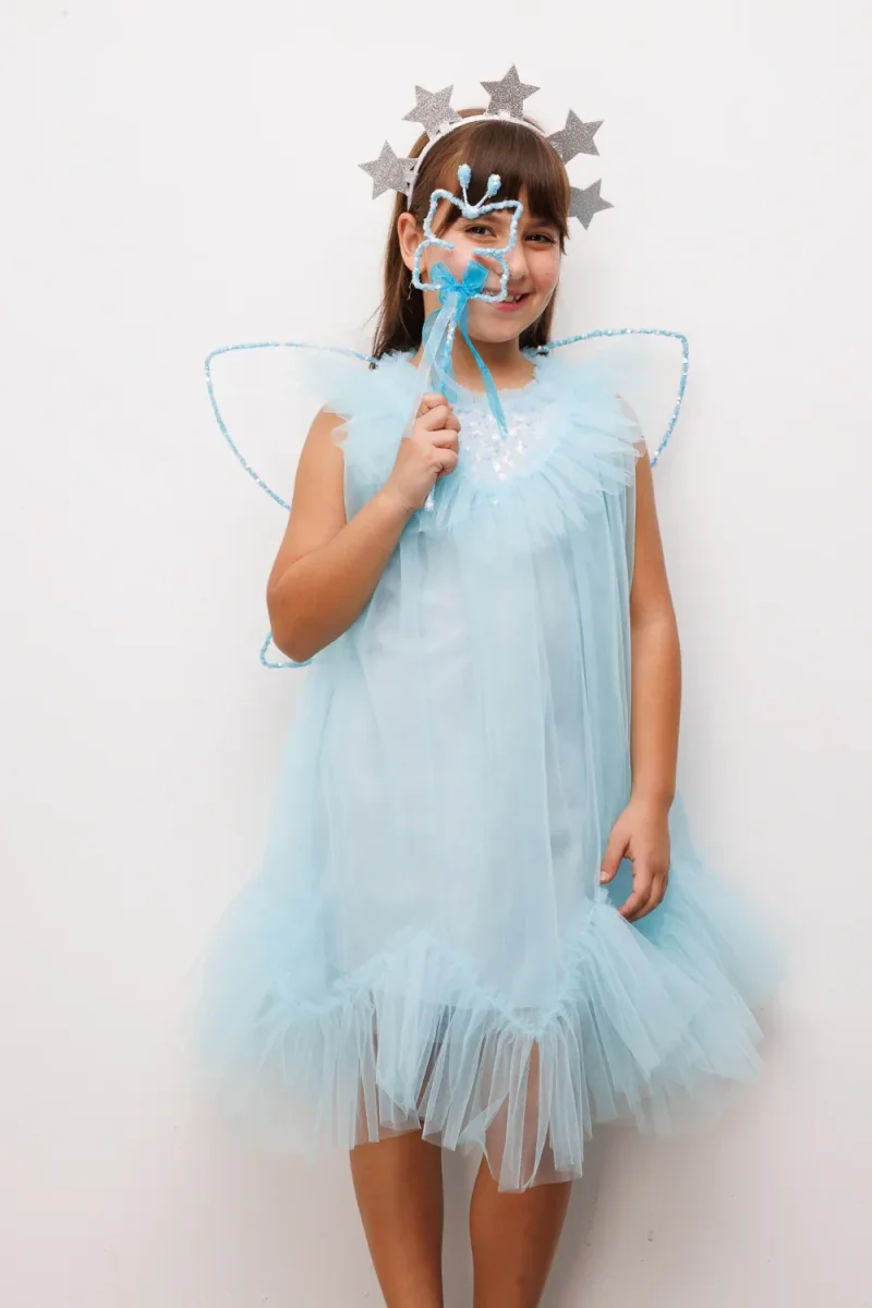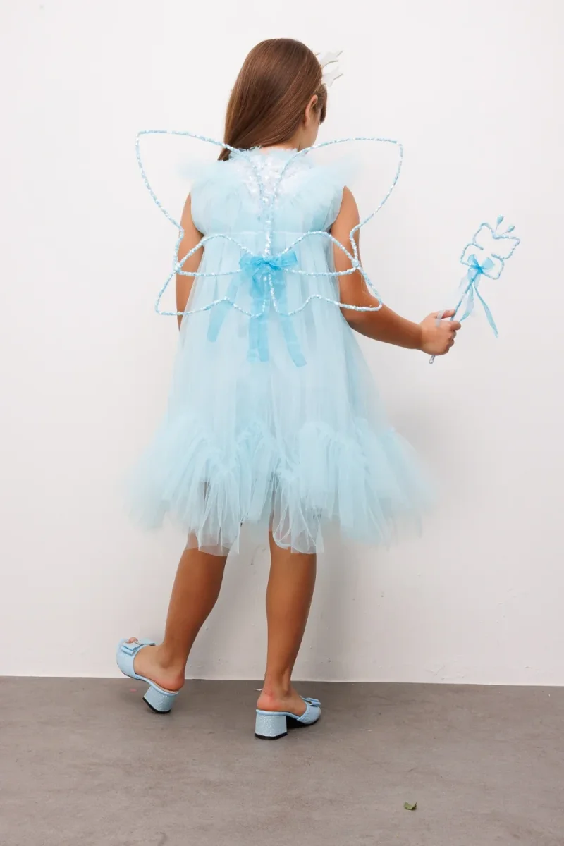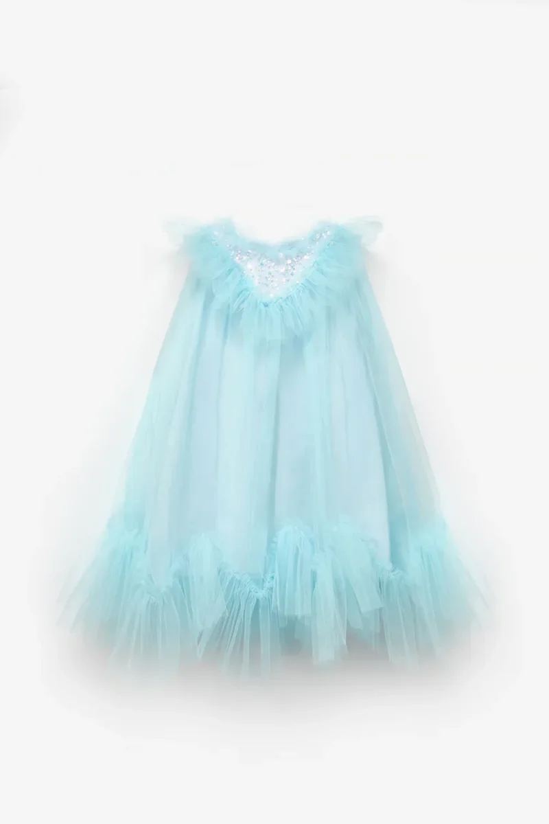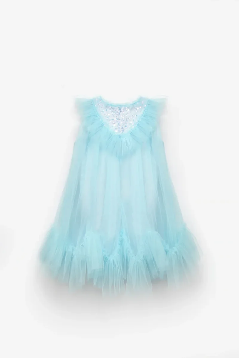 Abito elegante in tulle per bambina con sfrange delicate nella parte inferiore e dettagli scintillanti di paillettes che catturano la luce. La chiusura posteriore con cerniera garantisce facilità di indossamento, mentre la vestibilità comoda permette libertà di movimento per giocare e ballare. Perfetto per occasioni speciali, cerimonie e momenti indimenticabili. Il tulle morbido e la tonalità celeste polvere creano un look raffinato e delicato, ideale per le piccole principesse.