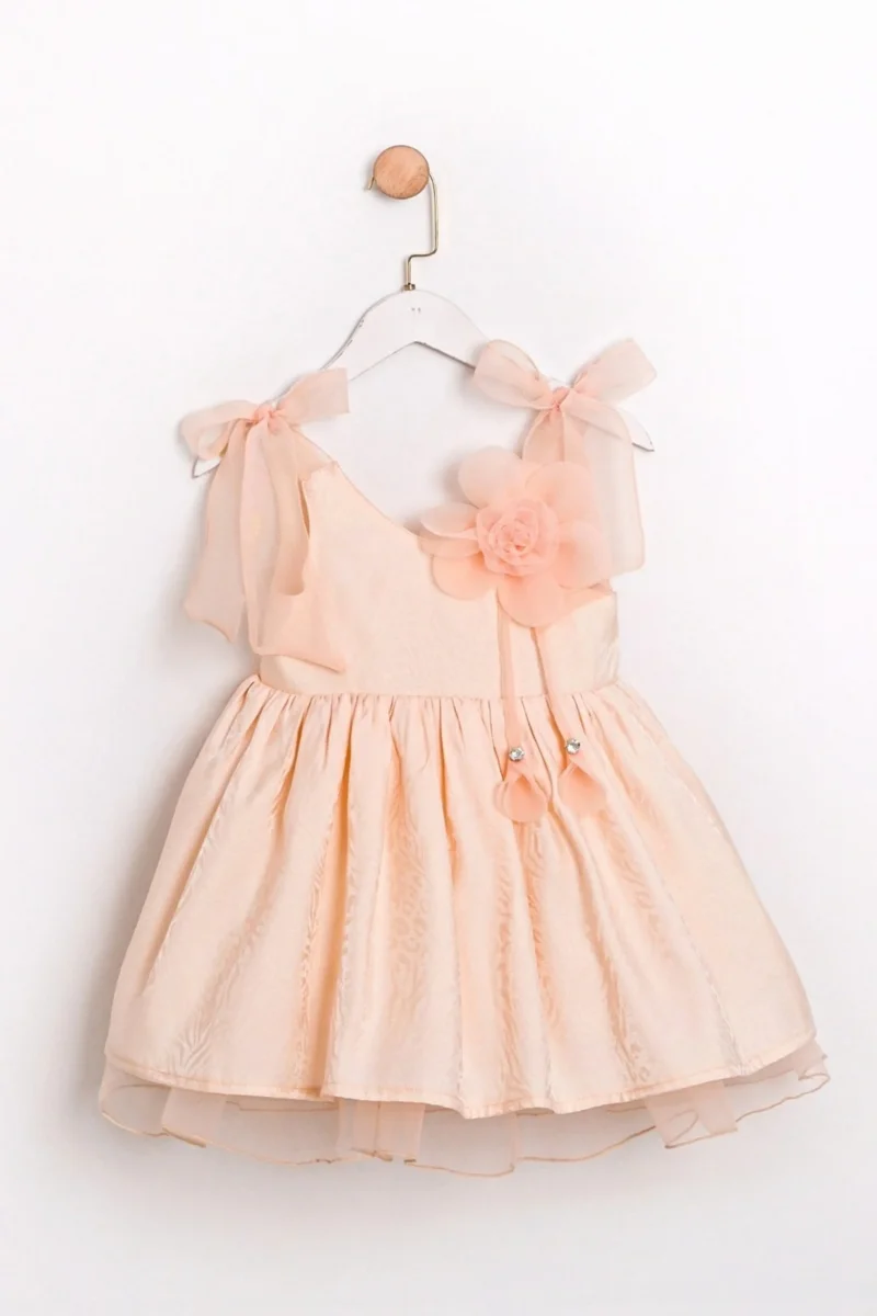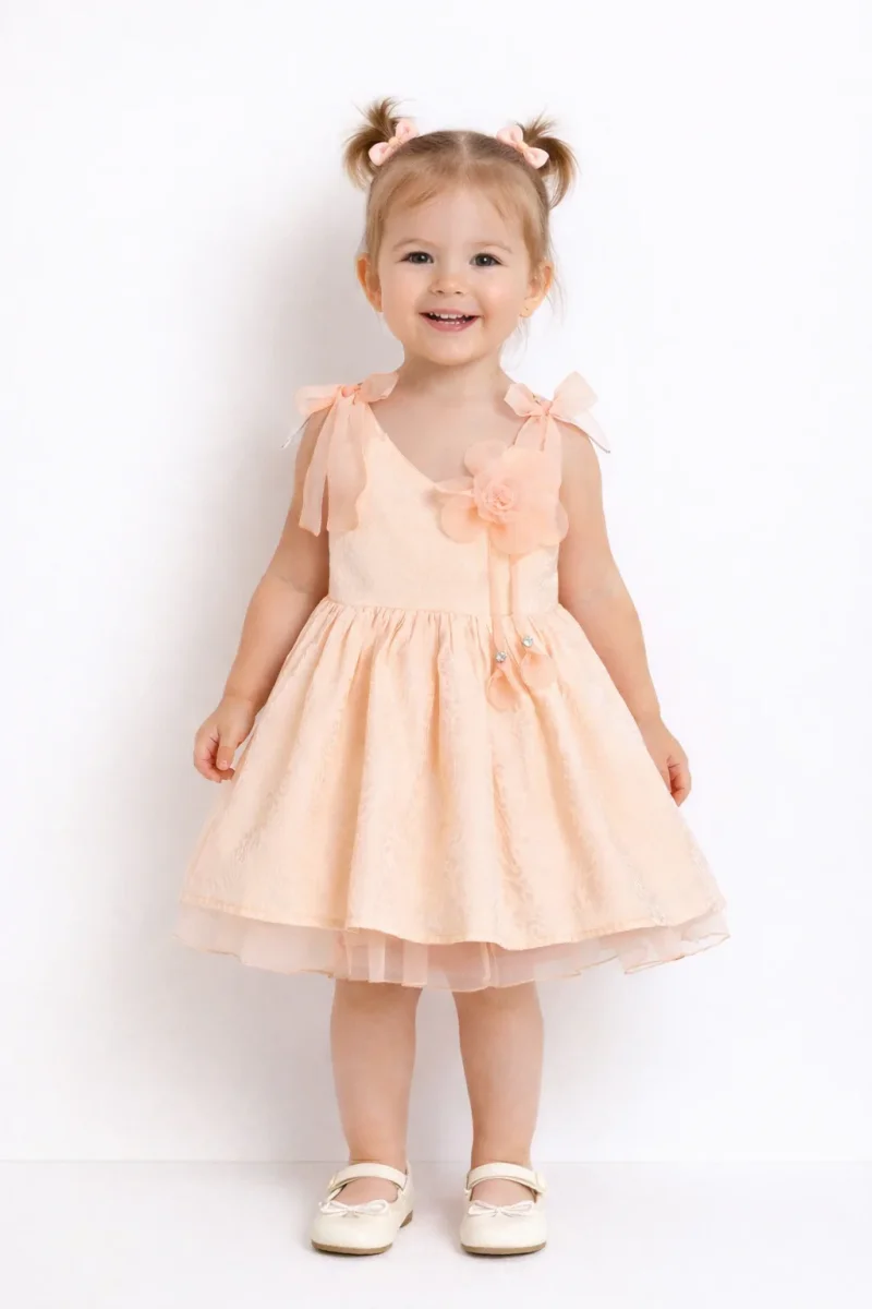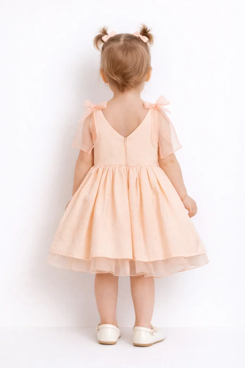 Eleganza audace per le piccole fashioniste. Questo abito in cotone giromanica cattura lo sguardo con fiocchi di tulle voluminosi sulle spalle e un delicato petto in tulle rosa che aggiunge movimento e femminilità. Lo scollo a V profondo sulla schiena rivela un dettaglio sorprendente, mentre la chiusura a lampo garantisce praticità senza compromessi. Perfetto per cerimonie e occasioni speciali dove il tuo bambino merita di brillare con stile inconfondibile.