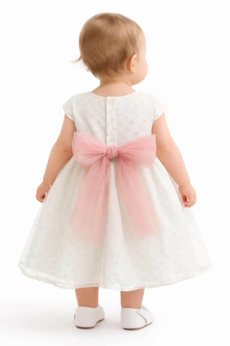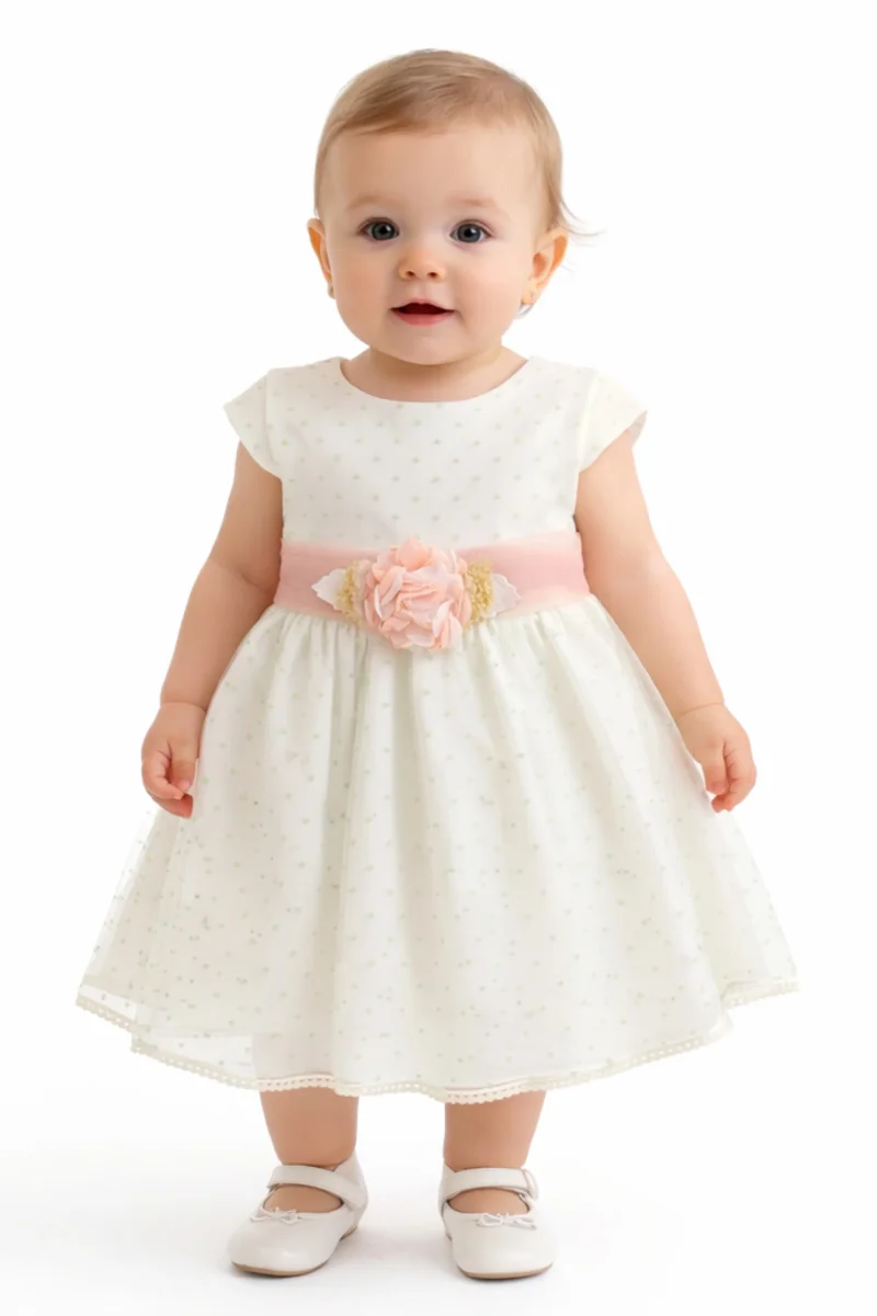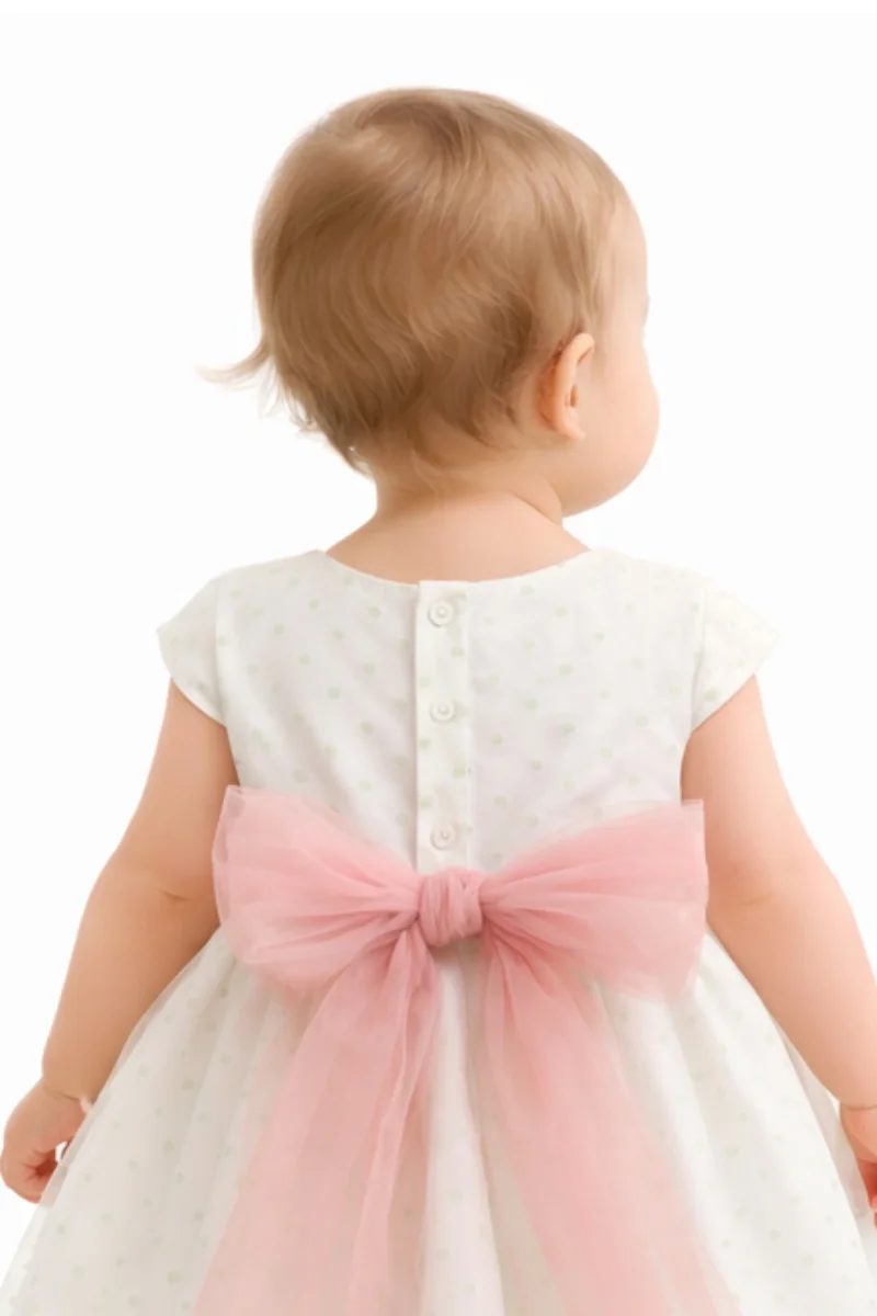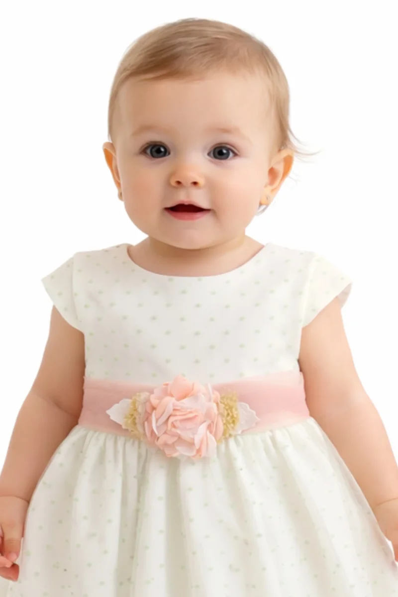 Eleganza sofisticata per il giorno più speciale. Questo abito da battesimo in cotone, seta e tulle cattura lo sguardo con il suo delicato motivo a pois sul fondo. La cintura in tulle rimovibile si adatta perfettamente alla vita, mentre la spilla di fiori aggiunge un tocco di grazia floreale. Chiusura posteriore con bottoni per un indosso facile. Un capolavoro di dettagli raffinati che trasforma ogni momento in una celebrazione indimenticabile.