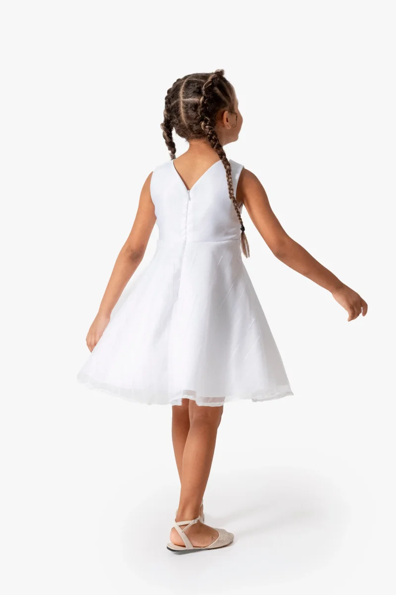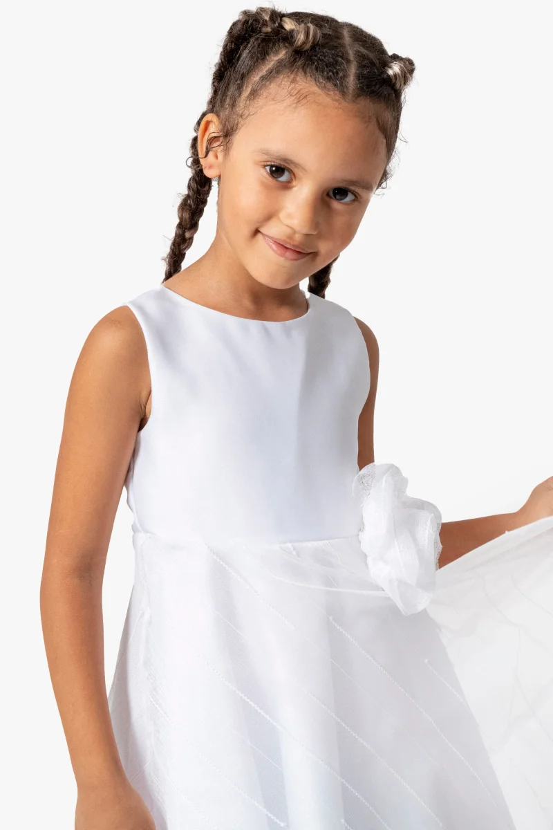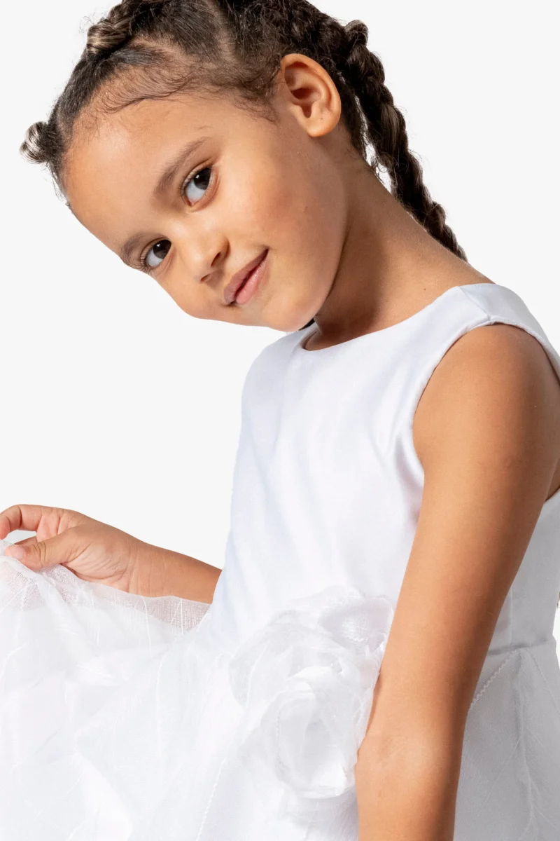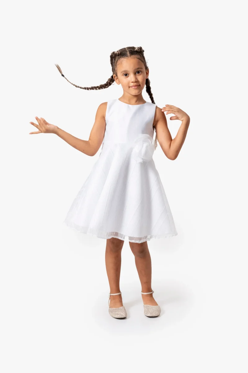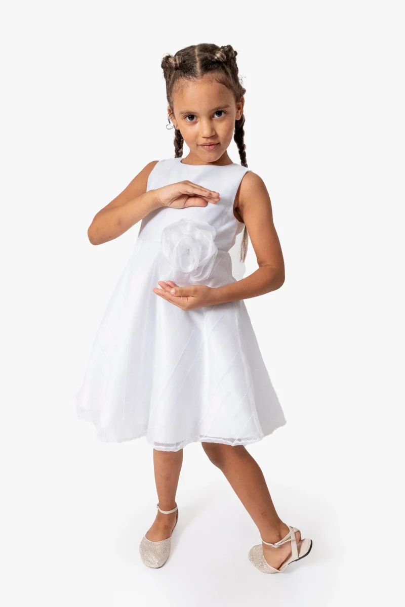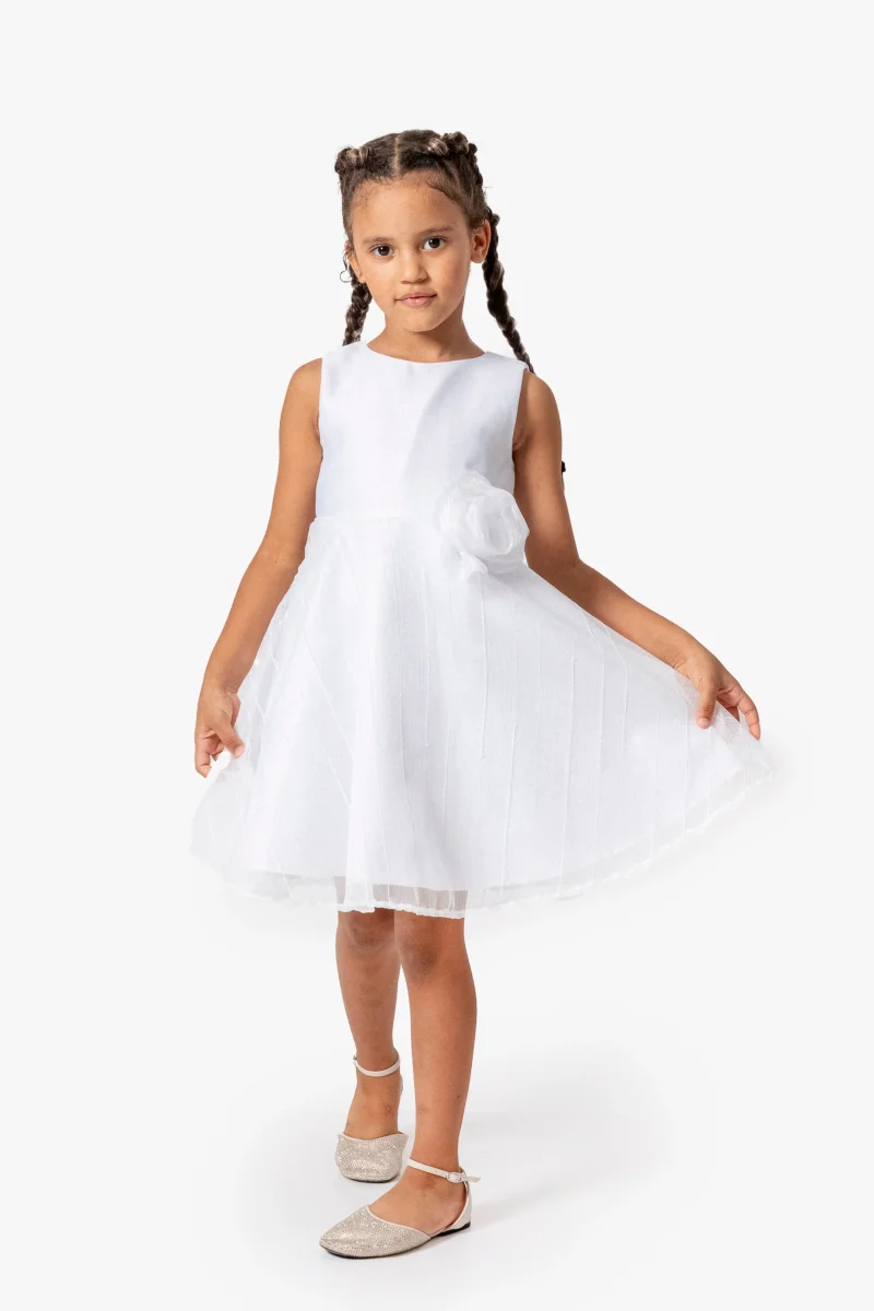 Donna nel fiore della vita con l’abito di Venere! Questo elegante abito rosa in tulle è adornato da un grazioso fiore in vita. Con chiusura a zip sul retro, lunghezza al ginocchio e modello svasato, dona un look raffinato alla tua bambina.