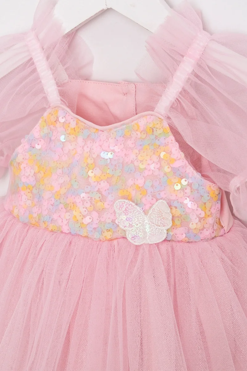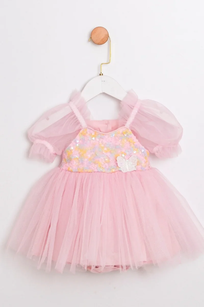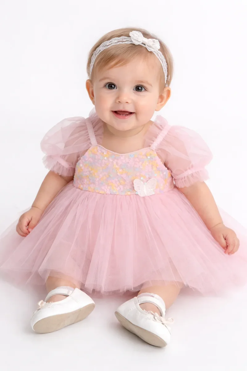 Eleganza audace per le tue piccole principesse. Questo abito body neonata combina cotone morbido e tulle etéreo, con chiusura posteriore a bottoni per un cambio pratico. Le paillettes multicolor sul petto catturano la luce con un tocco di glamour, mentre le maniche in tulle aggiungono movimento e raffinatezza.