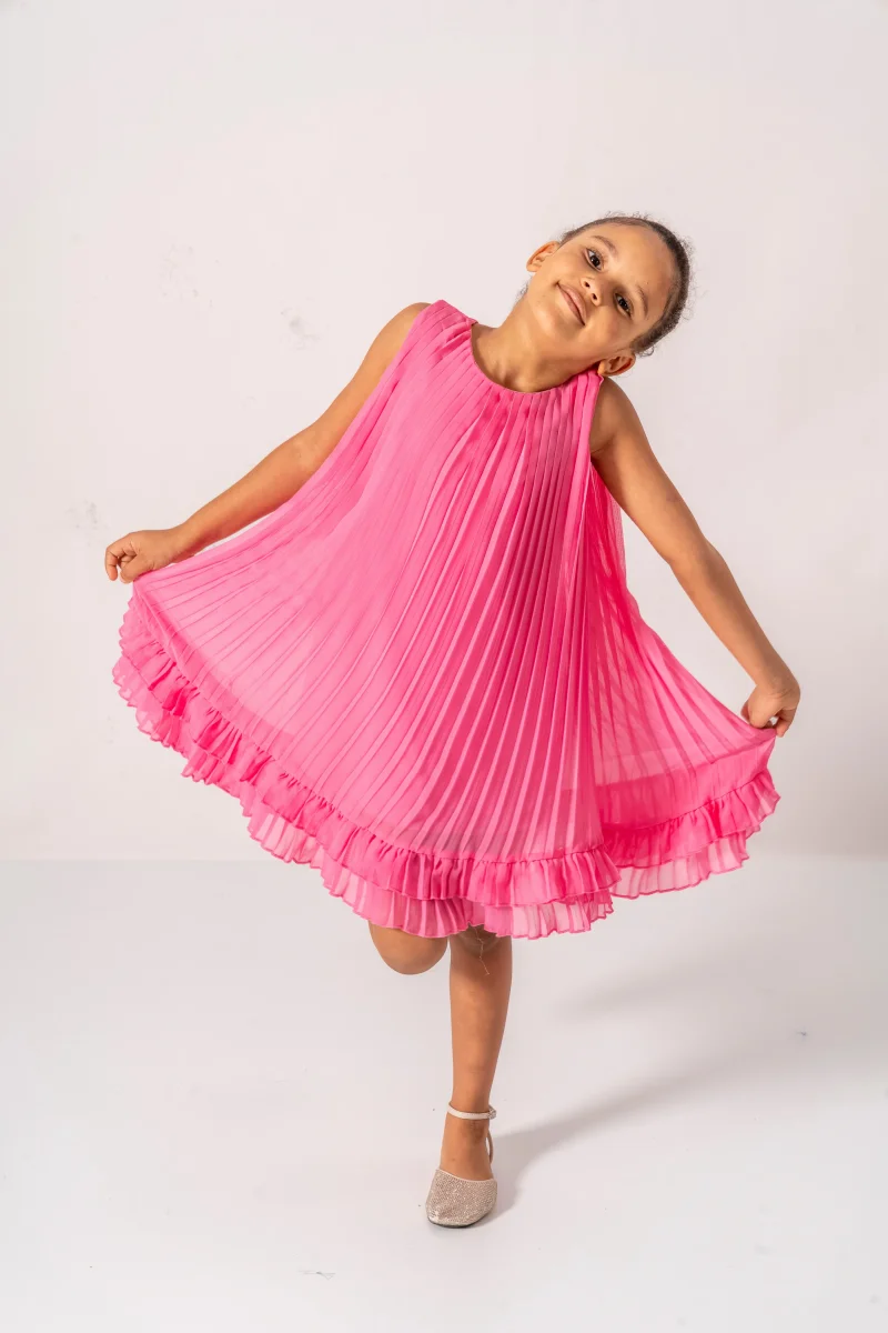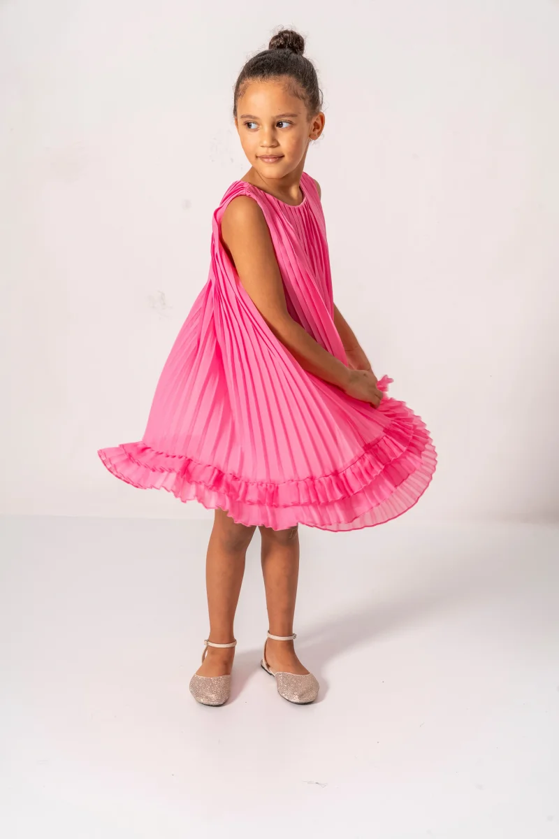 Colore fucsia, movimento in plissettato, dettagli in cotone. Un abito morbido e divertente per la tua bambina, perfetto per danzare. Da indossare in occasioni speciali o per un look unico e giocoso. Aggiungi un tocco di colore al suo guardaroba!