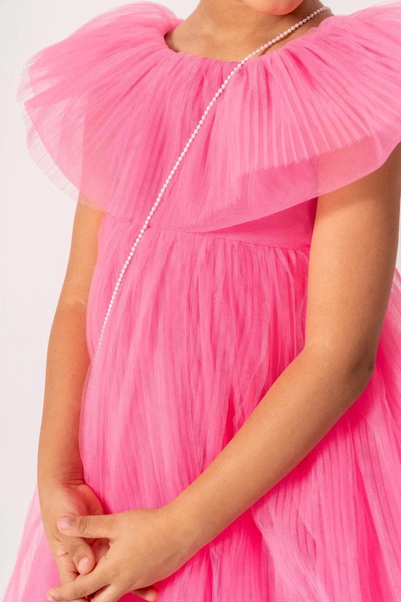 Aggiungi un tocco di magia al guardaroba della tua bambina con questo abito in tulle. Il voluminoso scollo a barca e la cintura in vita aggiungono un tocco di eleganza, mentre la lunghezza al ginocchio rende questo abito perfetto per ogni occasione. Con chiusura posteriore a cerniera per un facile indossamento. Un must-have per ogni piccola fashionista!