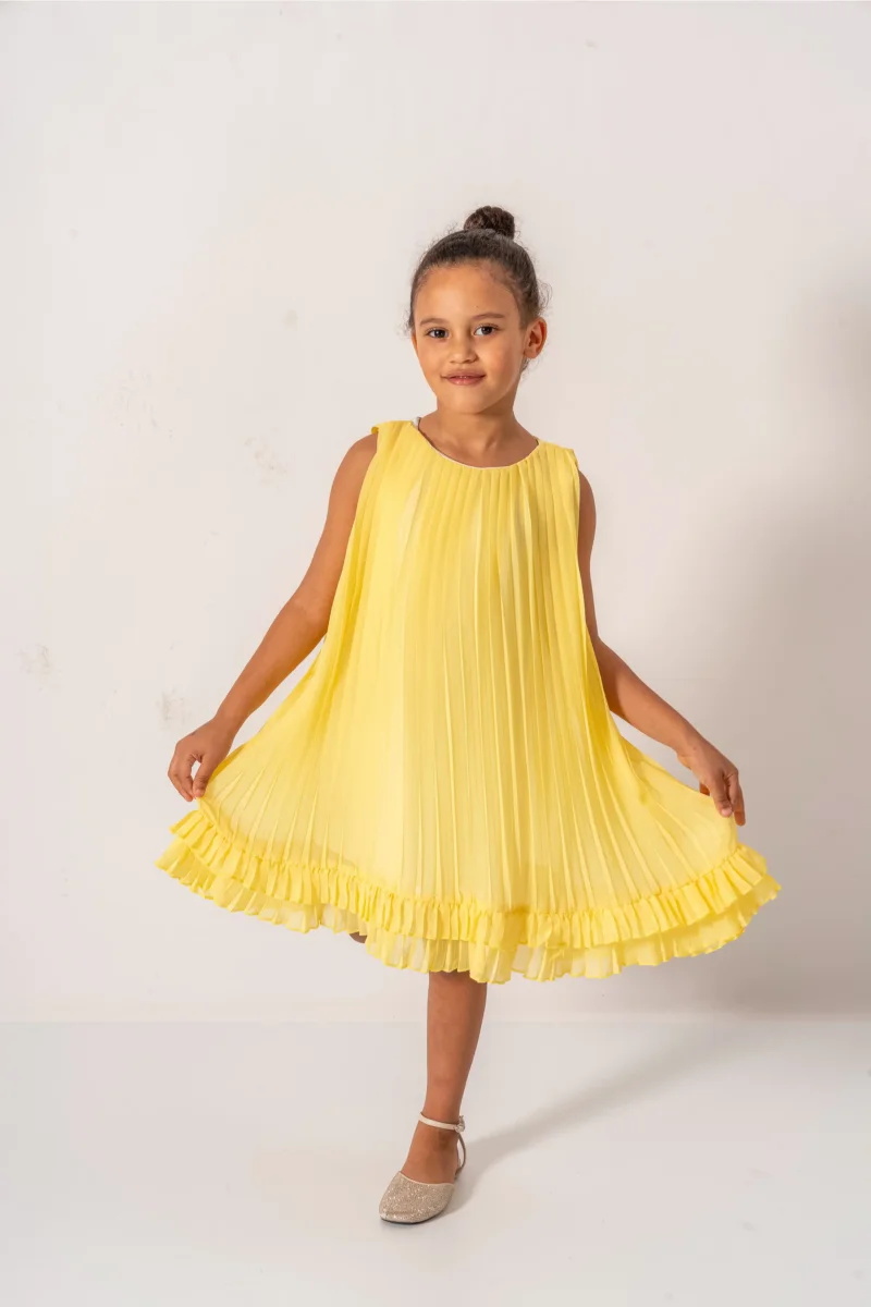 Colore giallo, movimento in plissettato, dettagli in cotone. Un abito morbido e divertente per la tua bambina, perfetto per danzare. Da indossare in occasioni speciali o per un look unico e giocoso. Aggiungi un tocco di colore al suo guardaroba!