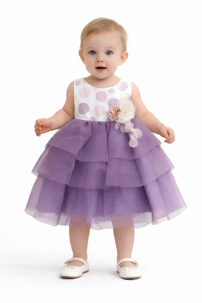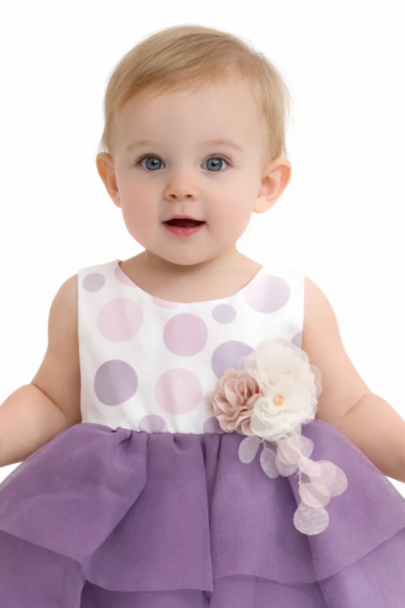 Abito neonata che cattura l’essenza della femminilità audace. Il corpetto in cotone a pois multicolor gioca con motivi vivaci e giocosi, mentre la spilla di fiori rimovibile aggiunge un tocco di eleganza personalizzabile. La gonna a balze in tulle corta e voluminosa crea movimento e drammaticità a ogni passo, perfetta per occasioni speciali. La chiusura posteriore con cerniera garantisce praticità nel cambio, completata da un fiocco in tulle che incornicia la schiena con grazia. Un capo che trasforma ogni momento in una celebrazione di stile e personalità.