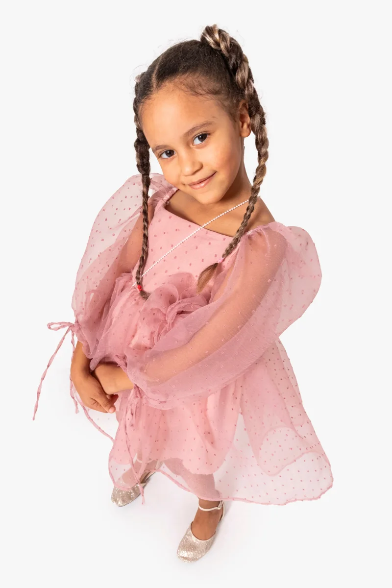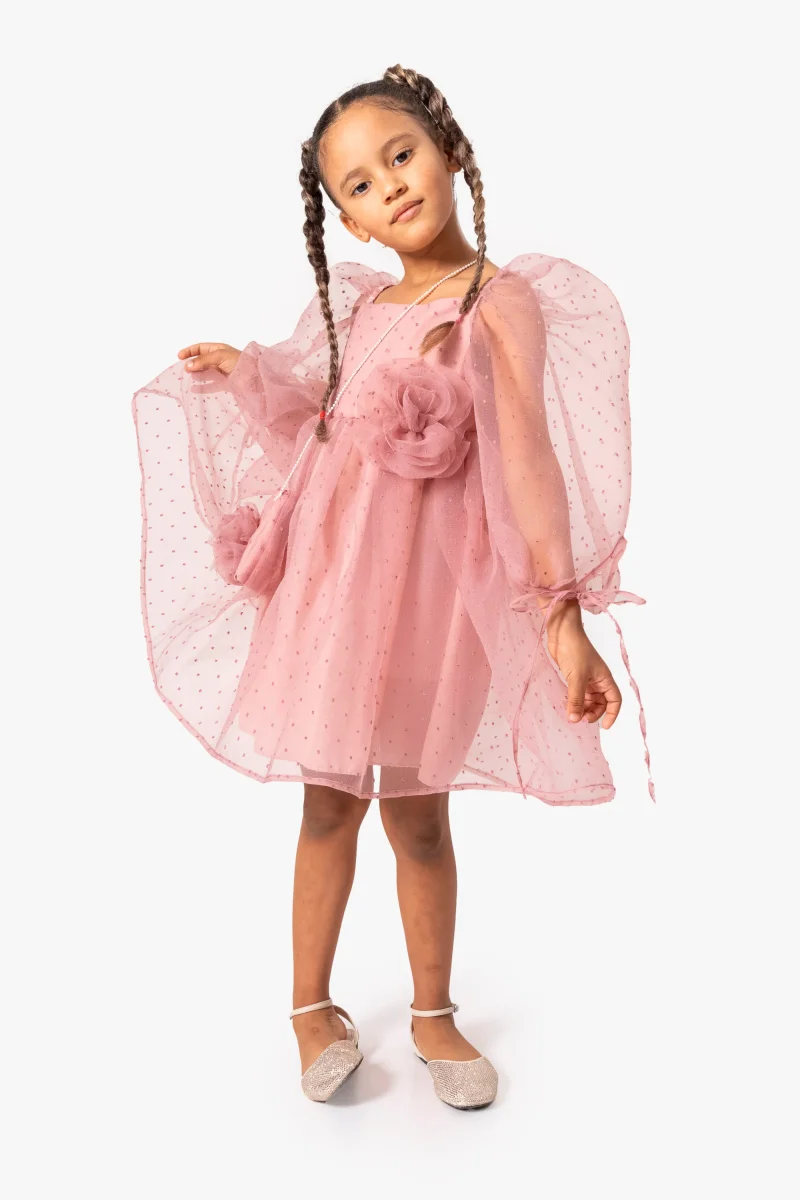 Prova questo vestito in tulle per bambina con maniche lunghe a palloncino e un bellissimo fiore in vita. Lunghezza al ginocchio e dettagli di piccoli pois rendono il vestito unico. Con una chiusura lampo posteriore, è facile da indossare e perfetto per ogni occasione speciale.