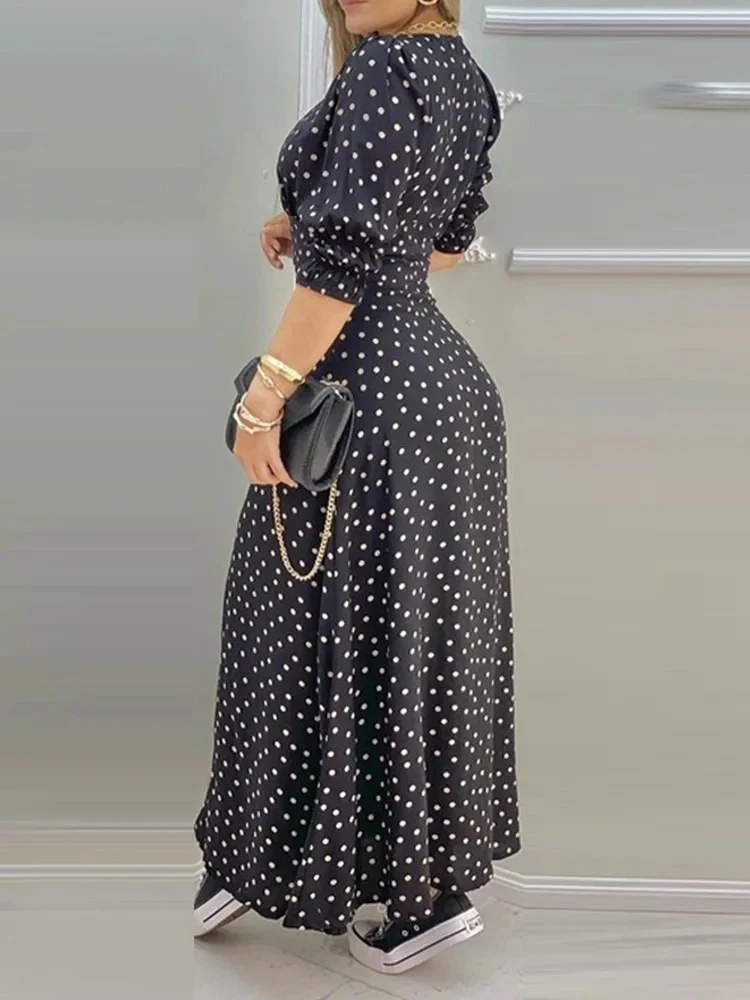 - Design elegante: La spaccatura e il motivo a pois aggiungono un tocco di sofisticatezza al tuo look.