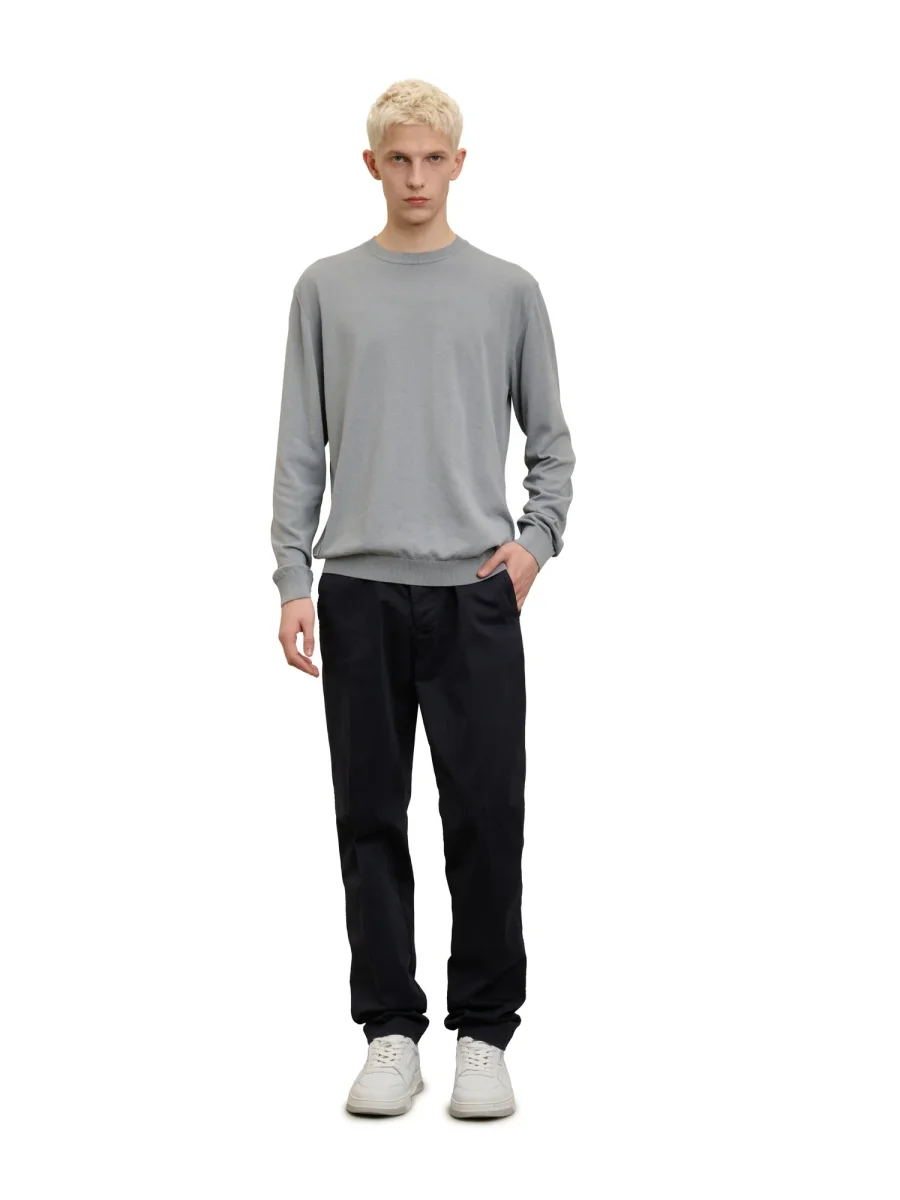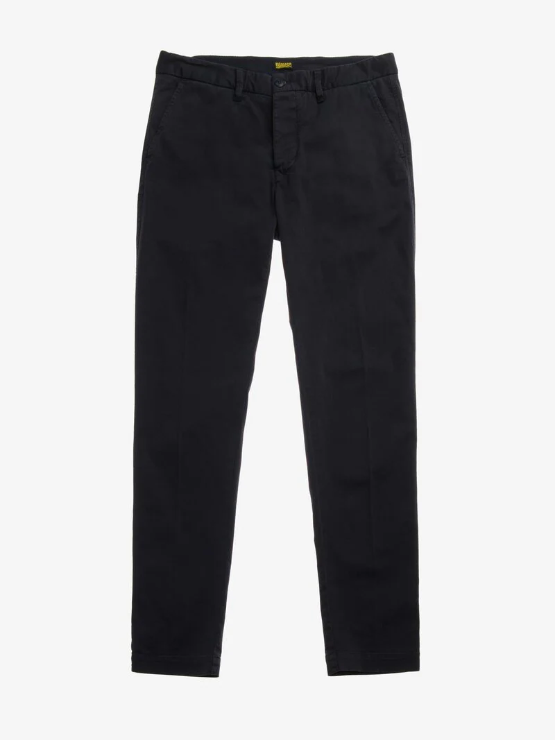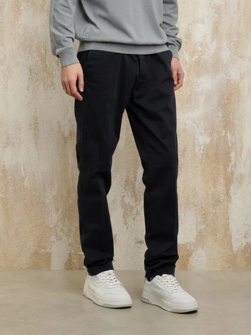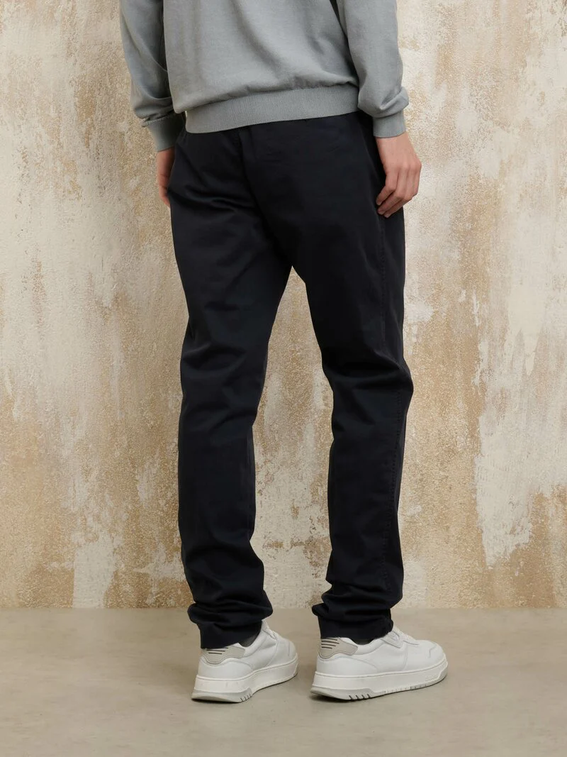 Pantalone lungo chino con gamba che stringe sul fondo. Tessuto tinto in capo per donare un effetto vissuto unico e irripetibile.