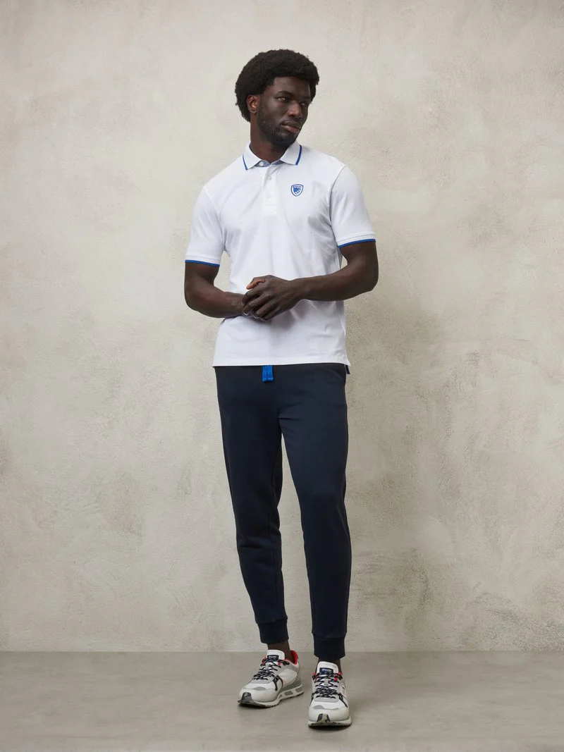 Polo uomo a manica corta in cotone piquet con collo e fondo manica in costina rigata in contrasto.Colletto chiuso da bottoni a quattro fori in contrasto.Inserto in cotone chambray sul bordo del colletto come la fettuccia interna negli spacchetti sul fondo.Capo leggermente più lungo nel retro.In contrasto colore Scudo Blauer sul petto a sinistra ricamato.Tessuto […]