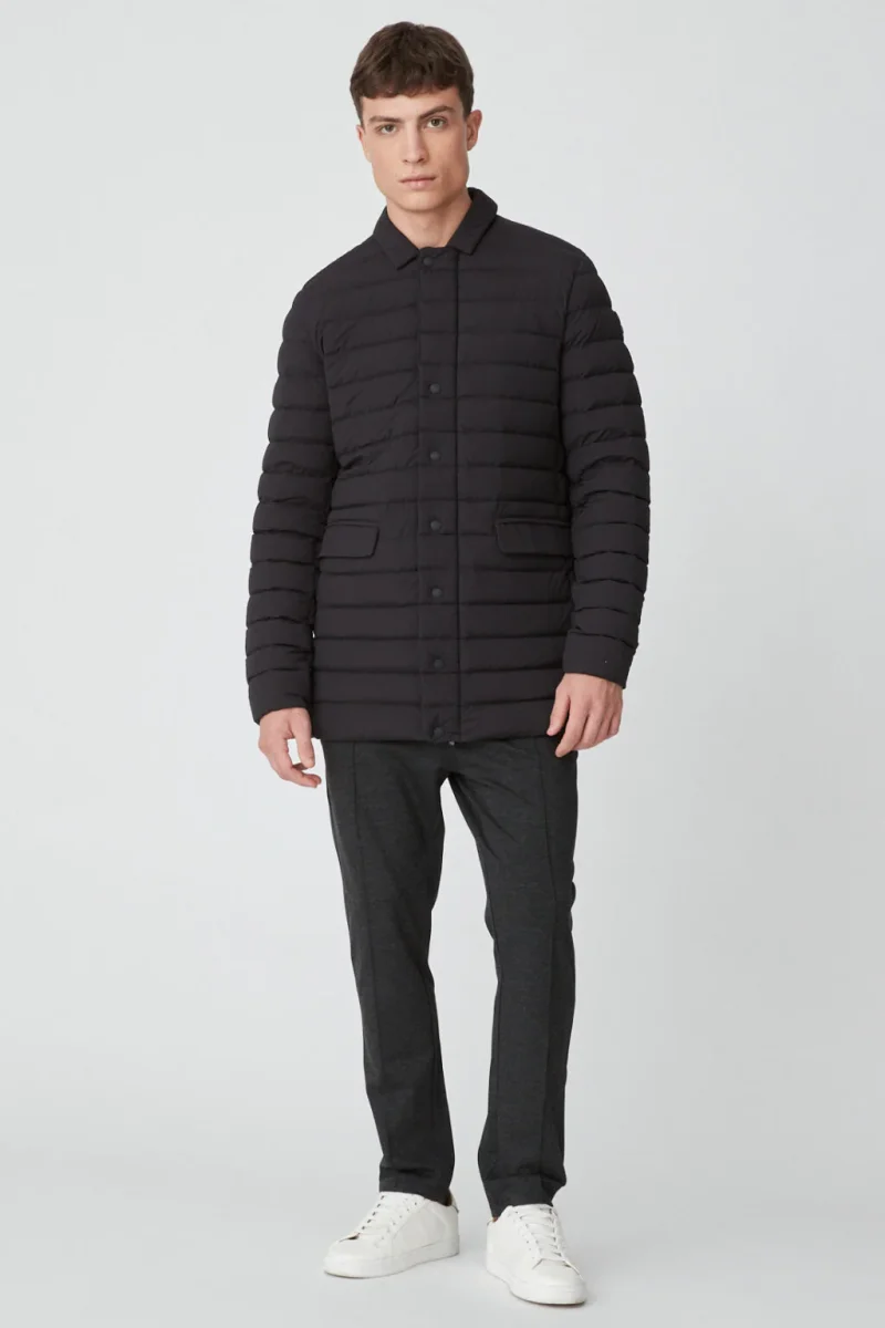 Cappotto lungo, realizzato in tessuto nylon stretch ed imbottito in vera piuma certificata 800 fill power. Il capo è caratterizzato da chiusura con bottoni automatici e logo istituzionale Ciesse Piumini in tono, due tasche laterali, colletto moribido. L’Aidan, realizzato in nuances scure ed intense, è funzionale, sofisticato e versatile. I ricchi dettagli di stile del capo contribuiscono a conferire alla giacca capacità termiche di idrorepellenza e traspirabilità più avanzate. Il modello si caratterizza per una forma che ricorda un cappotto lungo sopra al ginocchio, ed allo stesso tempo è valorizzato da filze che richiamano il mondo sportivo.