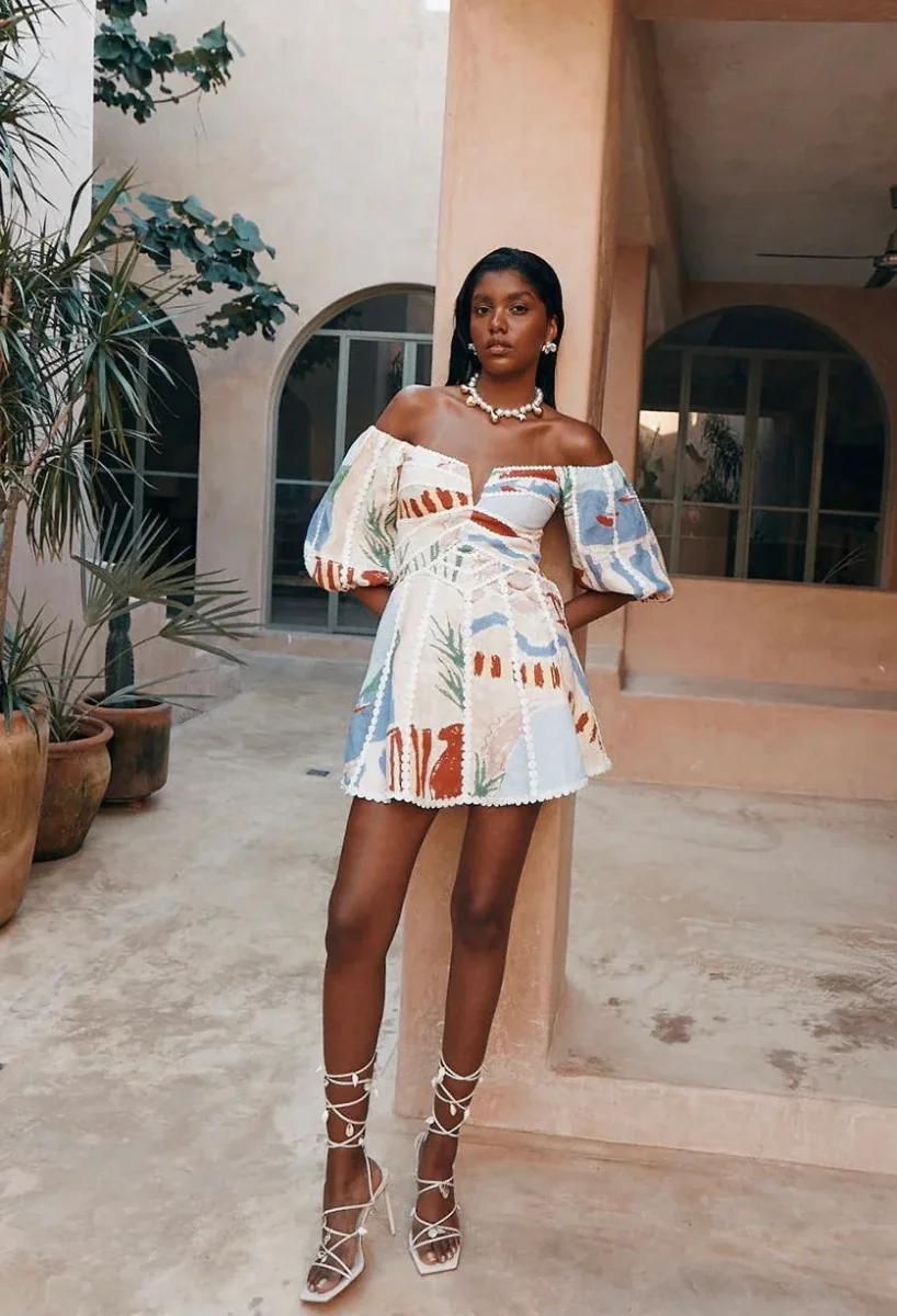 Lo scollo a spalle scoperte e le maniche a sbuffo aggiungono romanticismo ed eleganza, mentre le delicate rifiniture con pom-pom bianchi completano il look. Realizzato in tessuto leggero e traspirante, è perfetto per il clima caldo, combinando comfort e stile.