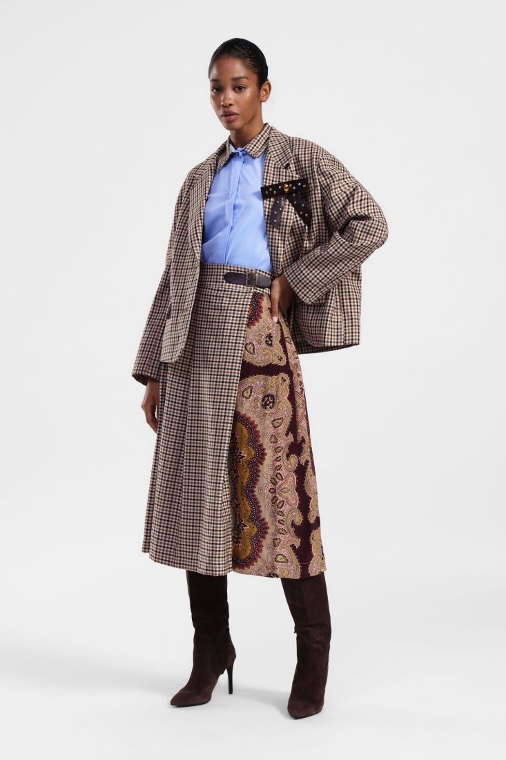 Questa gonna media a vita alta รจ un mix perfetto tra eleganza e versatilitร quotidiana. Caratterizzata da un design a blocchi di colore, offre un look unico che non passerร inosservato. Dettagli attentamente curati e una vestibilitร comoda la rendono ideale per un look chic durante tutto il giorno.