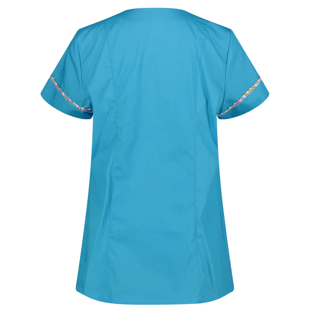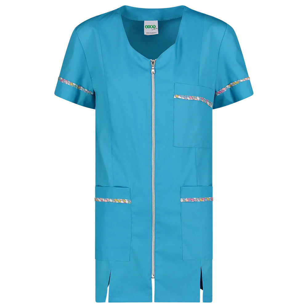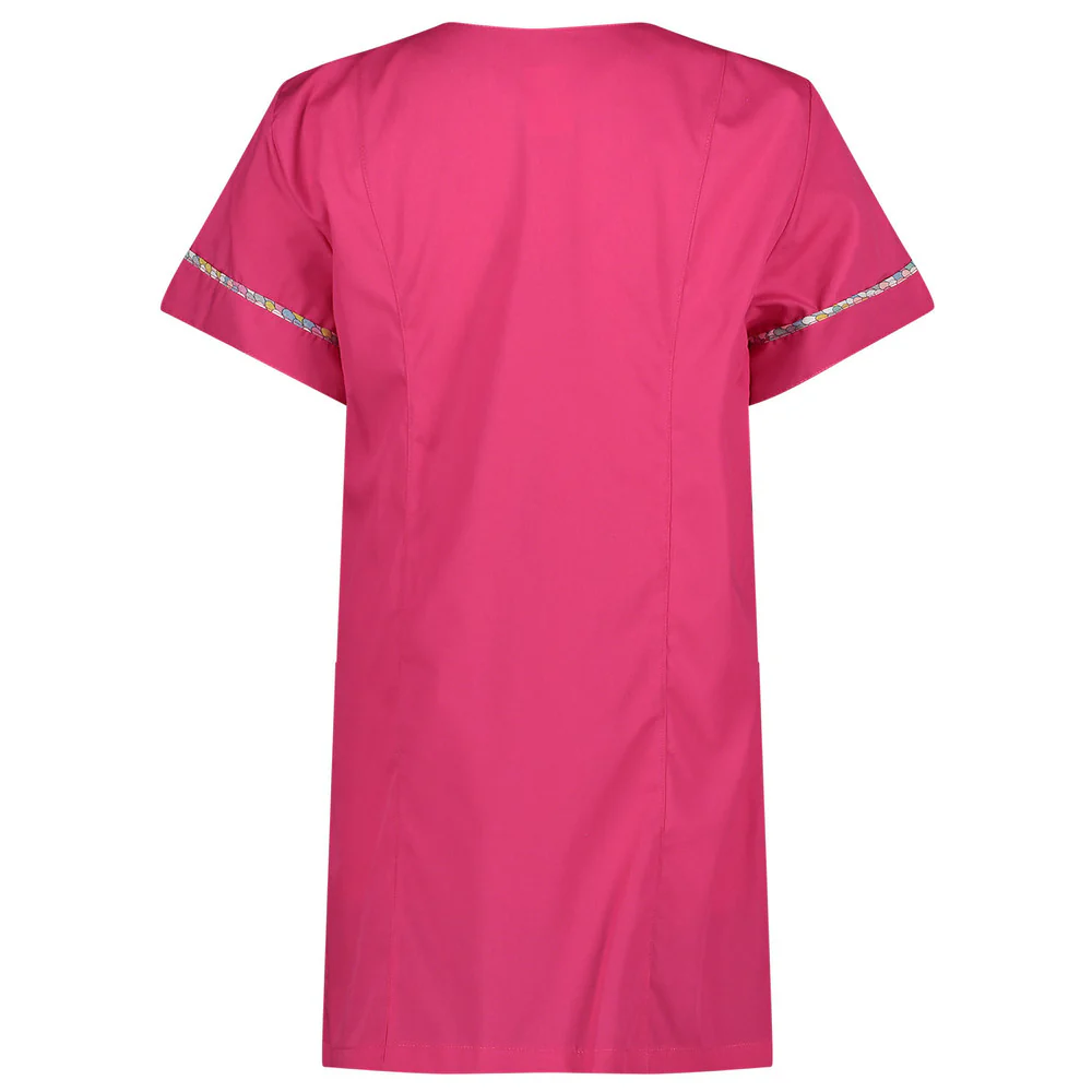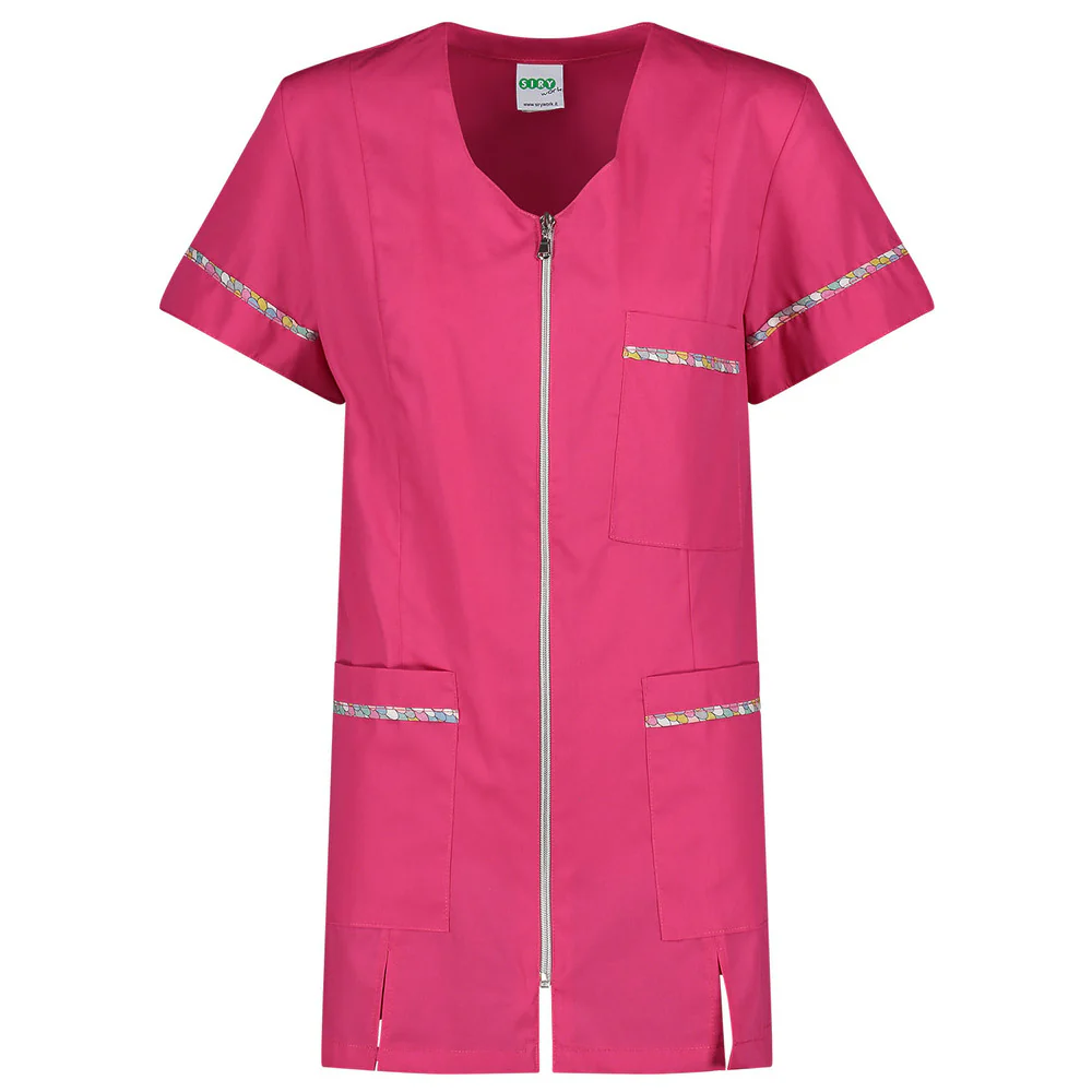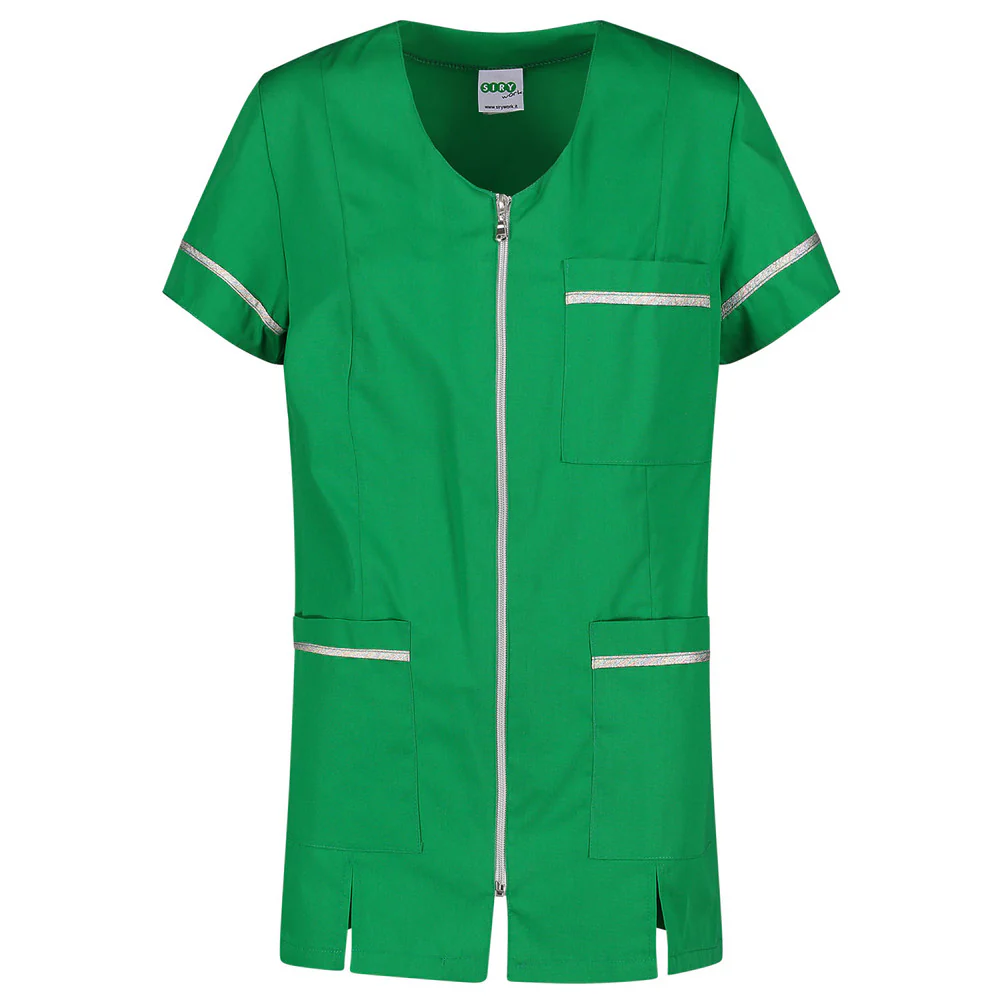 Il tessuto in misto cotone (35% cotone, 65% poliestere) garantisce massima traspirabilità, resistenza ai lavaggi frequenti e una facilità di stiratura imbattibile. I dettagli colorati sulle maniche e sulle tasche aggiungono un tocco di personalità e freschezza al tuo divisa da lavoro.