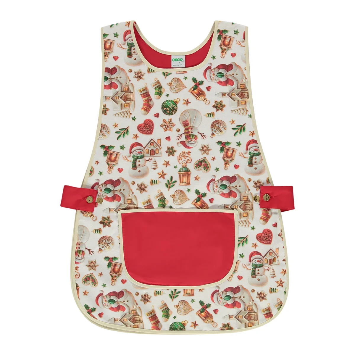 Il grembiule è realizzato in un tessuto resistente e facile da gestire, nel classico modello a pettorina senza maniche. La base rossa è rifinita da un bordo a contrasto (panna/beige chiaro), ma il vero protagonista è la grande tasca frontale e le linguette laterali, decorate con una ricca e gioiosa fantasia natalizia: simpatici pupazzi di neve, casette illuminate, campanelle e stelle.