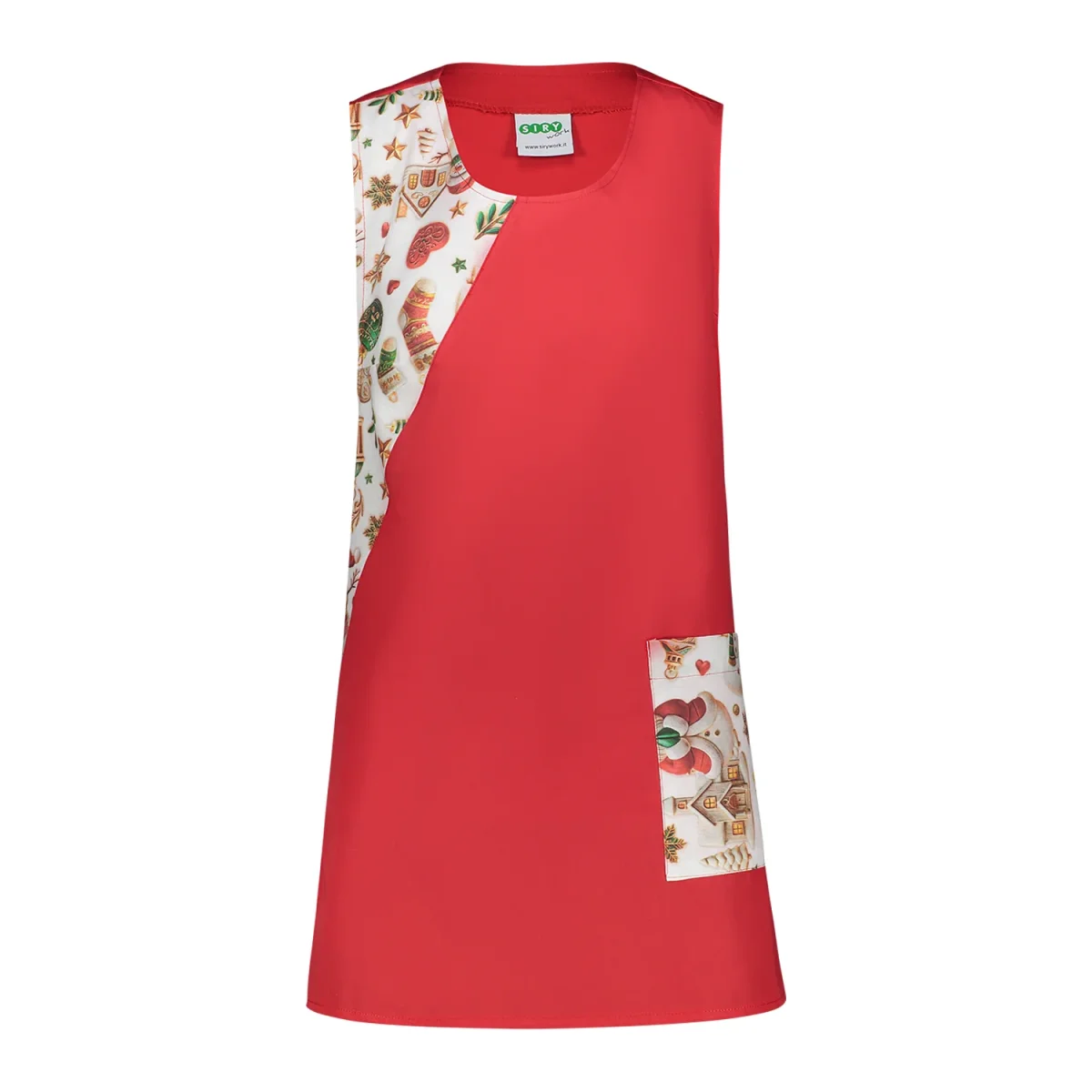 Design Festivo: L’inserto diagonale e la tasca con fantasia natalizia rendono la casacca unica e immediatamente a tema.