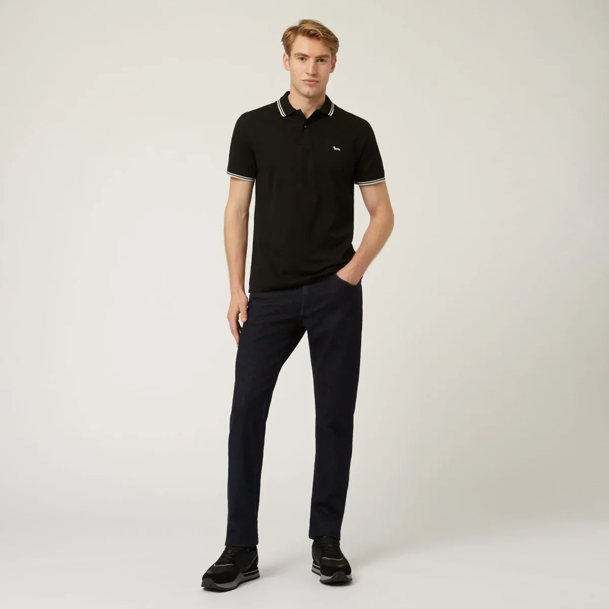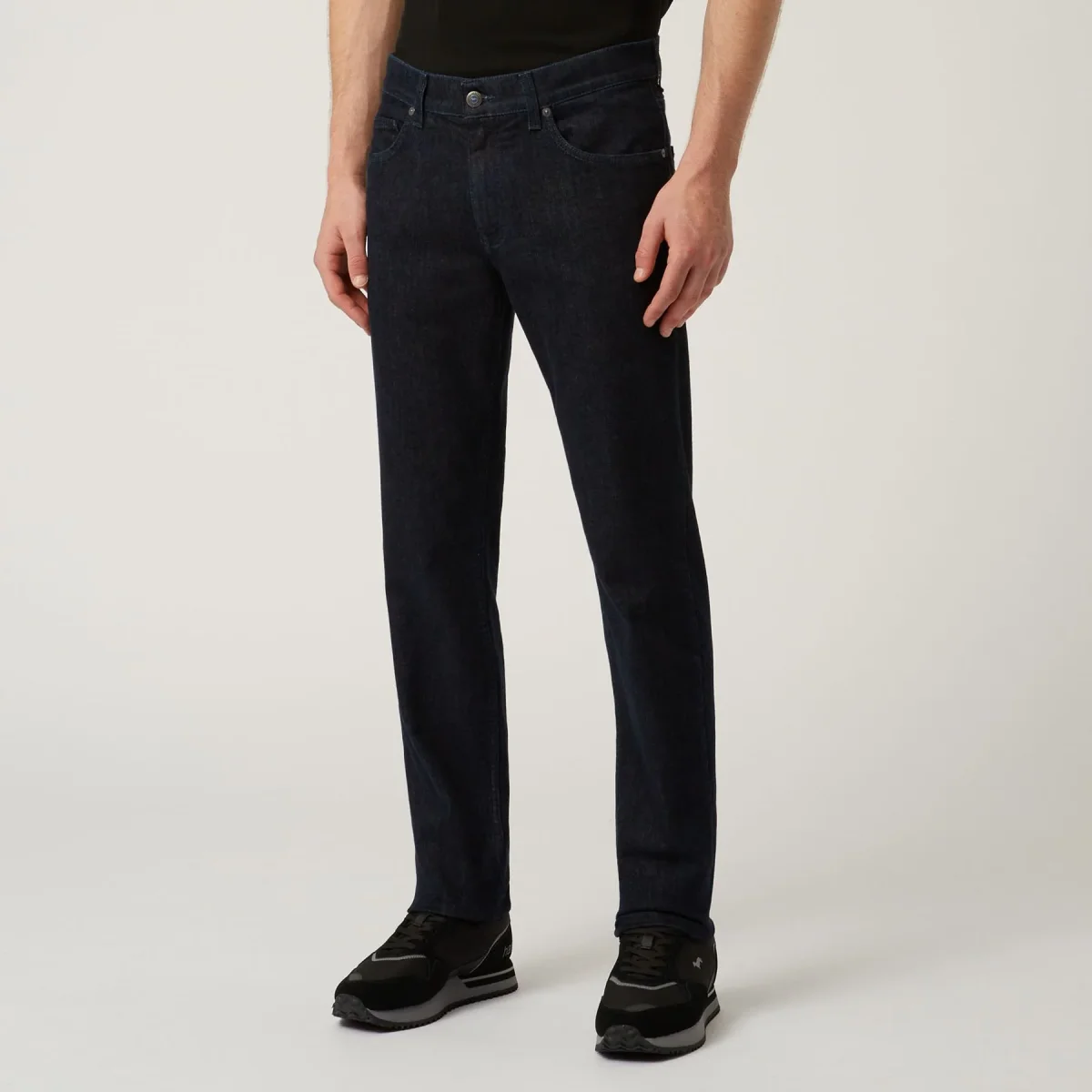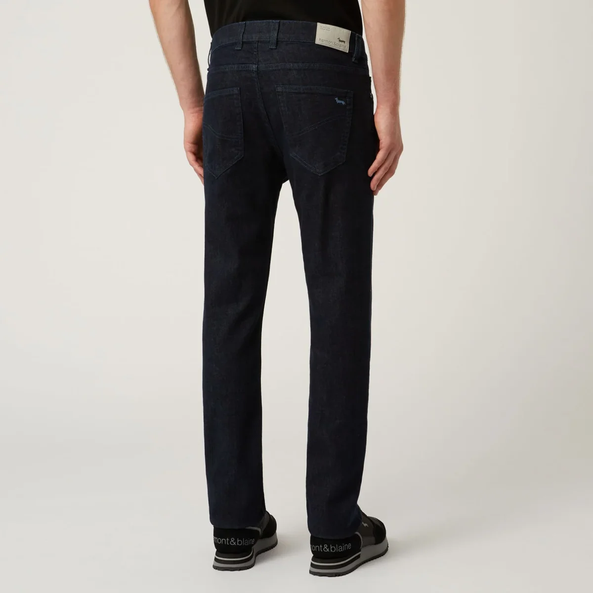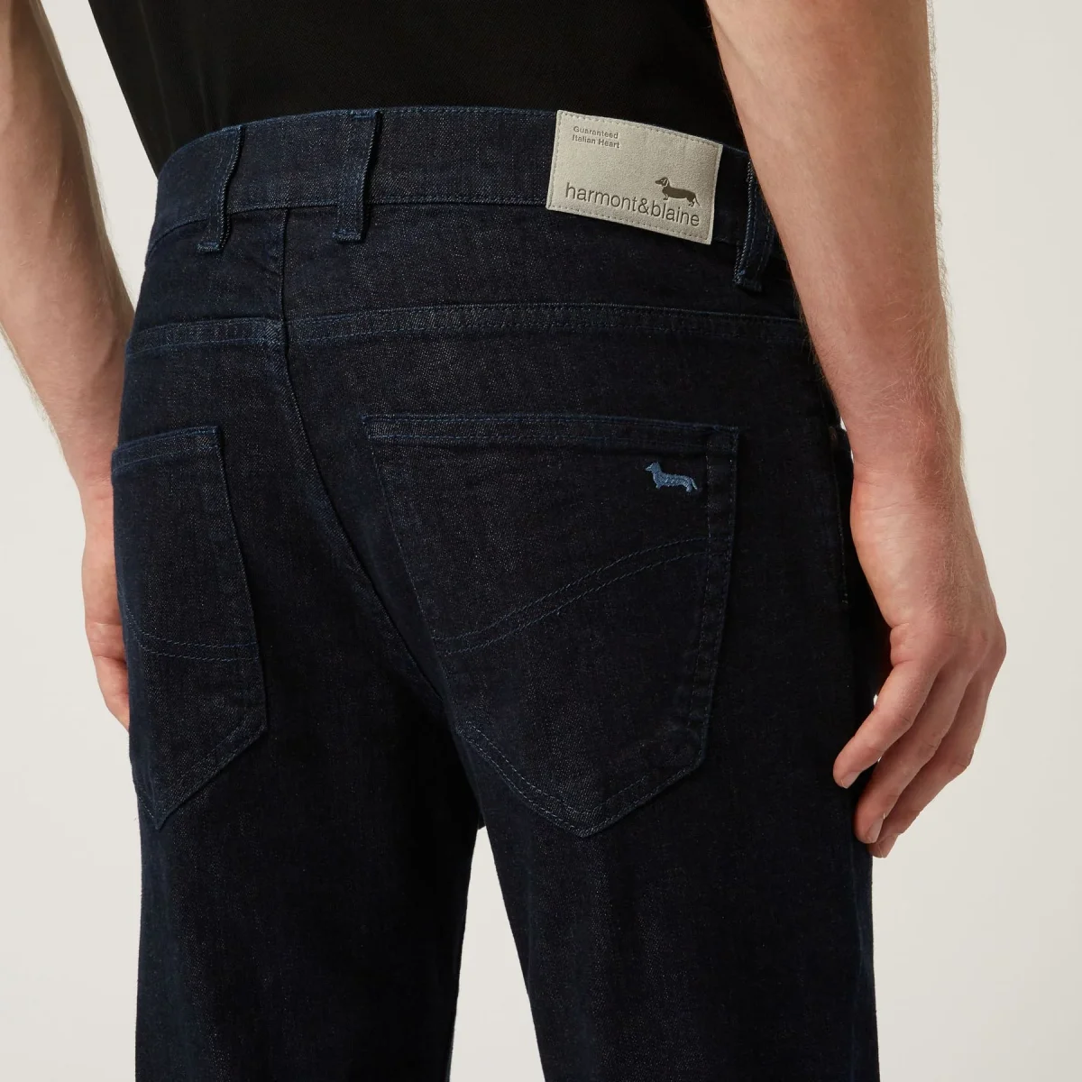 Pantalone denim cinque tasche in cotone stretch tinta unita con chiusura zip. Dettaglio iconico bassotto blaine sulla tasca posteriore.