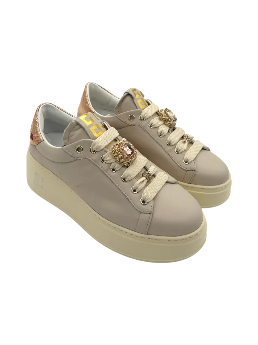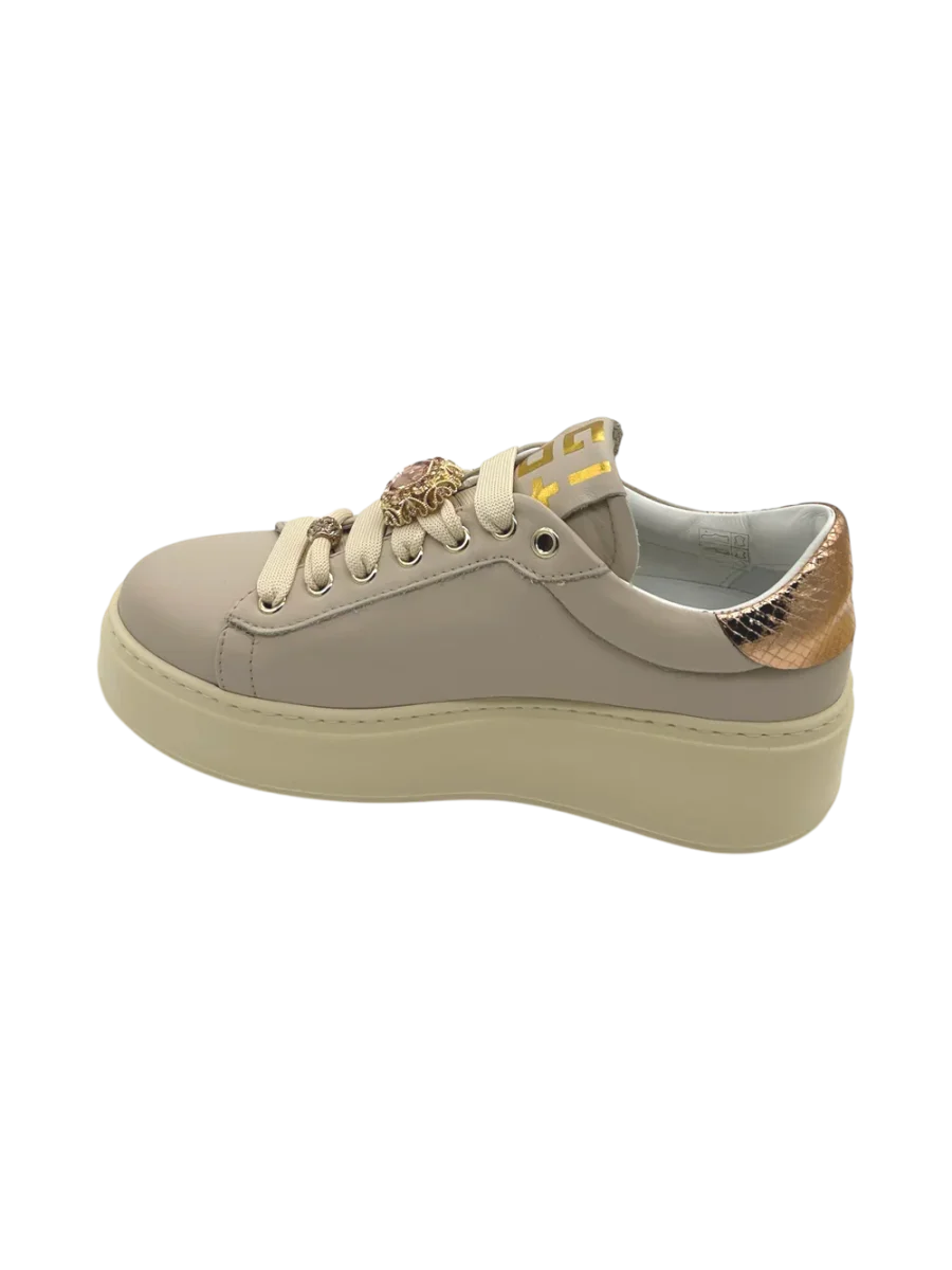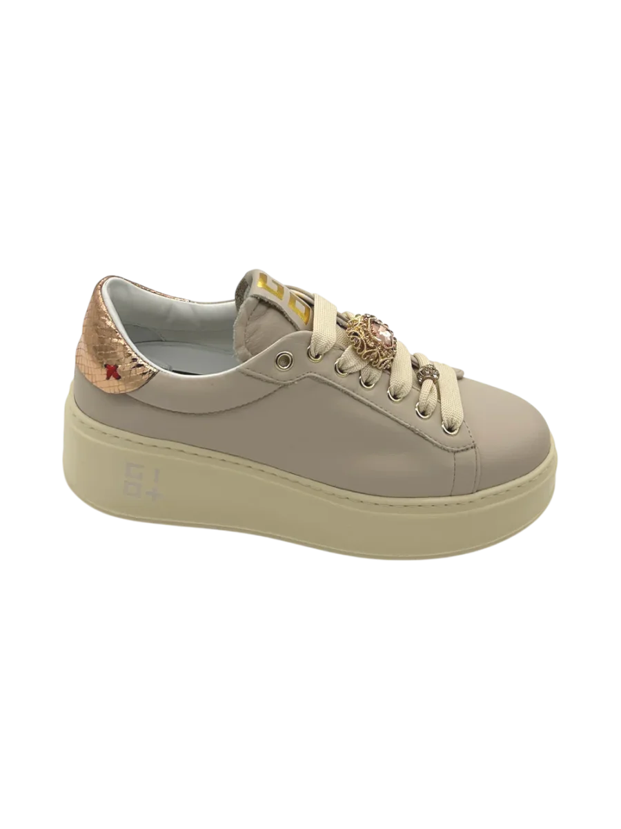 Sneakers GIO+ PIA 344A donna realizzata in pelle color Beige con decori su entrambi i lacci, suola in gomma eva leggerissima, rialzata di 5 cm per una calzata comoda. Il pratico plantare interno è in pelle ed estraibile. Applicazioni su entrambe i piedi.