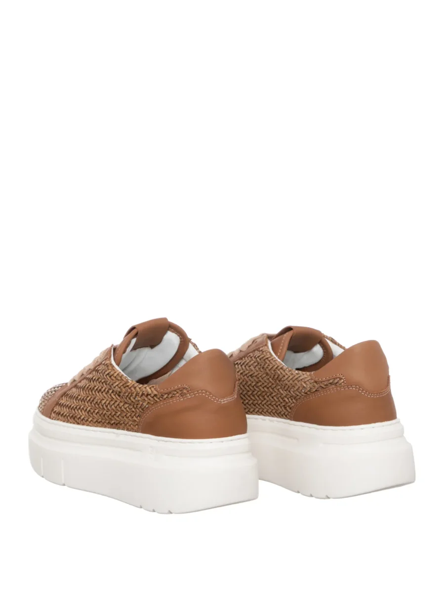 Sneakers GIO+ Aria50B donna In intreccio tessuto marrone con talloncino in beige. Caratterizzata da linguetta con il logo in laminato argento e riporti in pelle beige, lacci piatti in cotone.