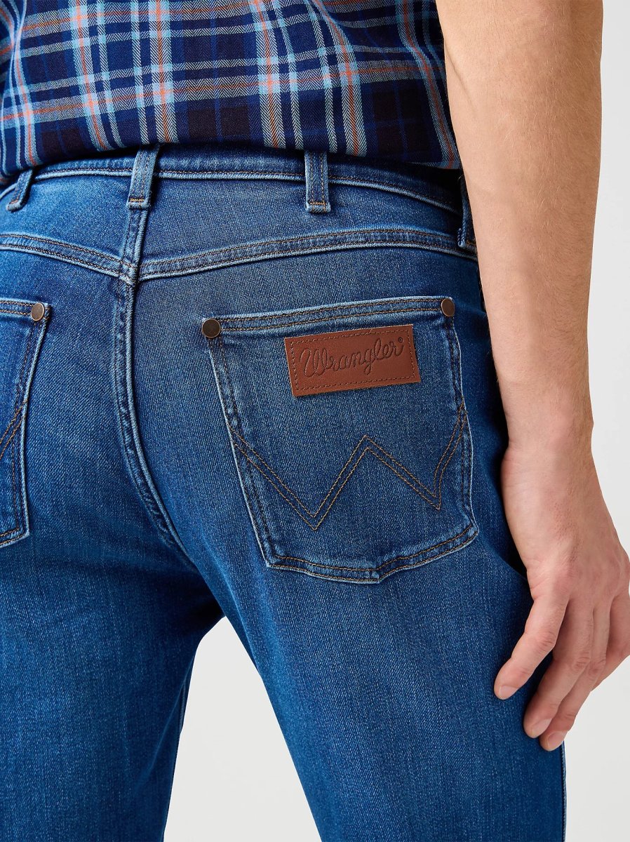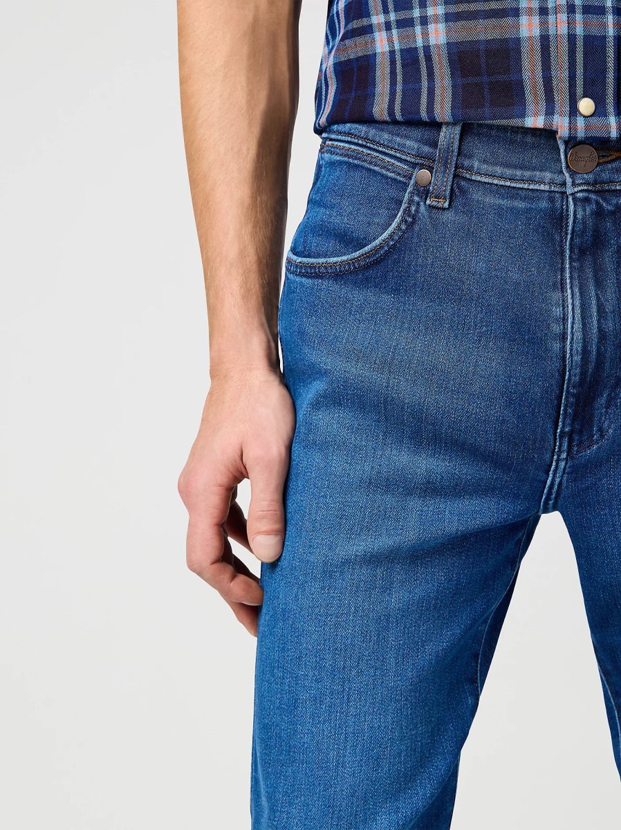 Il denim Wrangler Free to Stretch è realizzato con un tessuto elasticizzato ad alte prestazioni che garantisce massima libertà di movimento e mantenimento della forma.